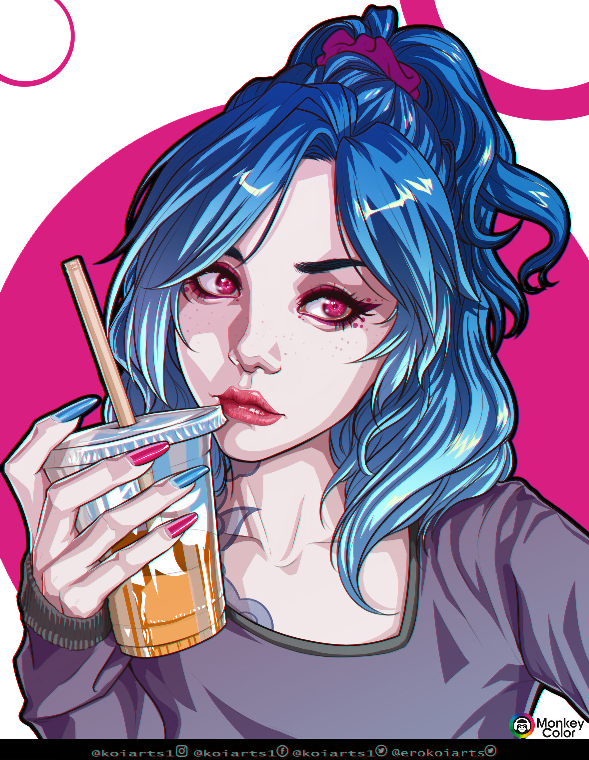 1girl absurdres alternate_costume alternate_hairstyle blue_hair cloud_tattoo collarbone cup disposable_cup freckles green_nails hair_ornament hair_scrunchie hand_up highres holding jinx_(league_of_legends) koiarts league_of_legends long_hair multicolored_hair parted_bangs pink_background pink_sweater ponytail portrait red_eyes red_lips red_nails red_scrunchie scrunchie solo sweater tattoo two-tone_hair white_background