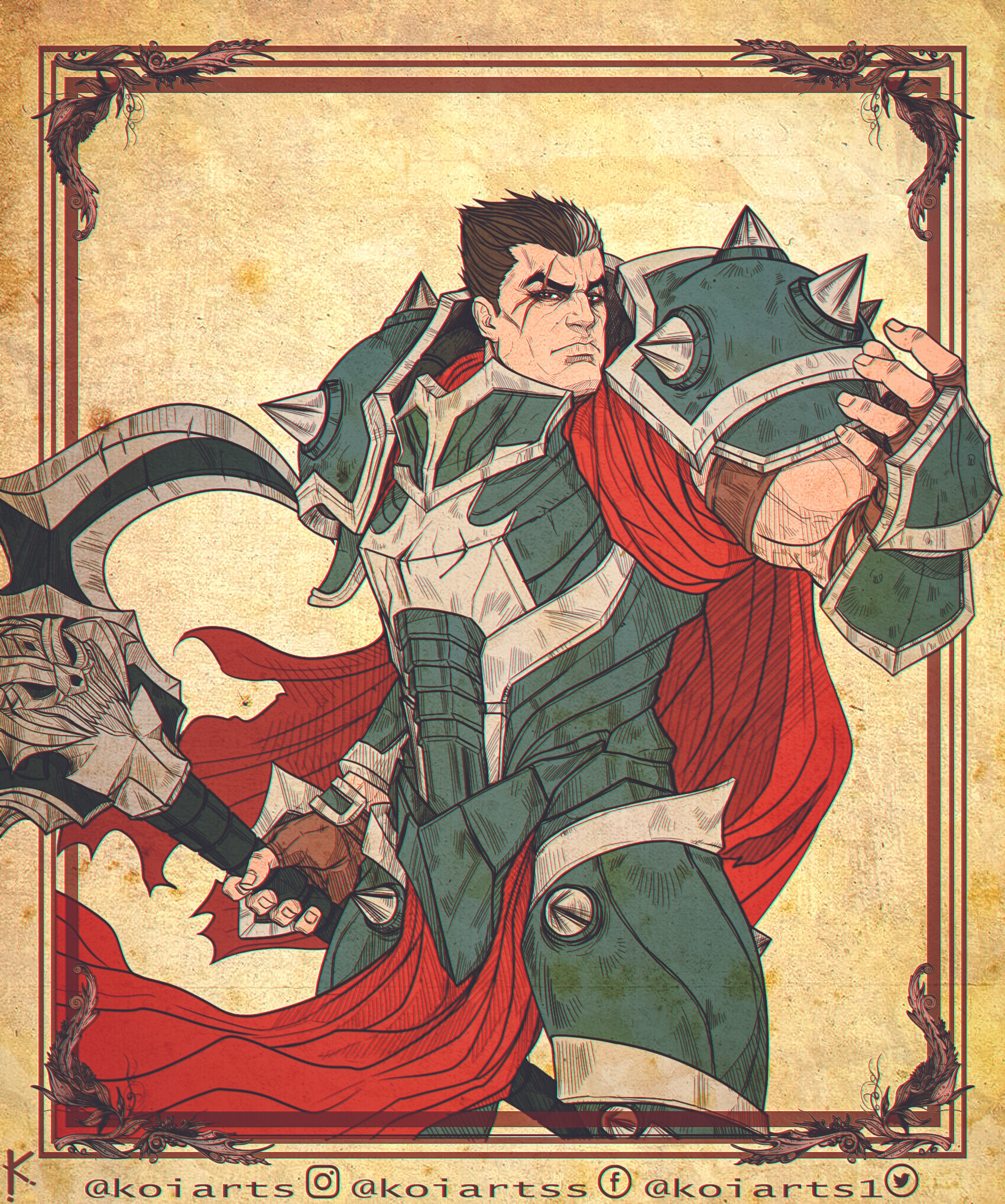 1boy armor axe brown_background brown_gloves brown_hair cape cowboy_shot darius_(league_of_legends) fingerless_gloves gloves gradient_background hand_up highres holding holding_axe holding_weapon koiarts league_of_legends looking_at_viewer red_cape scar scar_across_eye scar_on_face short_hair shoulder_plates shoulder_spikes solo spikes weapon white_hair