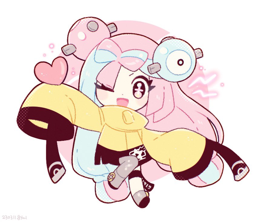 +_+ 1girl blue_hair blush chibi commentary heart iono_(pokemon) long_hair long_sleeves looking_at_viewer multicolored_hair nintendo one_eye_closed open_mouth oxo_xwo pink_eyes pink_hair pokemon pokemon_scarlet_and_violet sleeves_past_wrists smile solo untranslatable_commentary very_long_hair