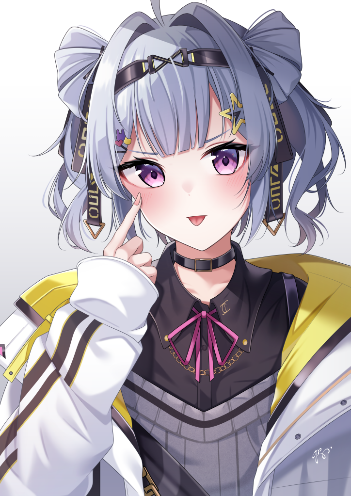 1girl ahoge black_choker black_shirt blush choker collared_shirt double_bun grey_hair grey_vest guri_(gri1211) hair_bun hair_ornament hairband jacket long_sleeves looking_at_viewer medium_hair nijisanji nijisanji_en purple_eyes school_uniform shirt star_(symbol) star_hair_ornament sweater_vest tongue tongue_out vest virtual_youtuber white_jacket zaion_lanza