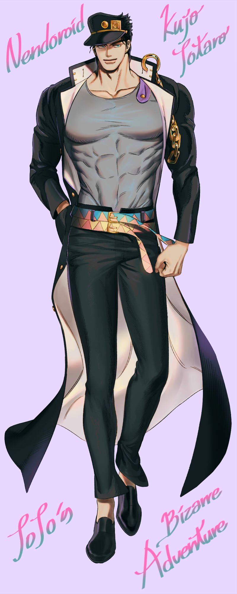 1boy abs belt black_hair black_pants blue_eyes chain character_name clenched_hand closed_eyes coat collarbone commentary copyright_name english_commentary full_body hand_in_pocket hat highres jojo_no_kimyou_na_bouken jojo_pose kuujou_joutarou lemona633 long_coat long_sleeves male_focus multiple_belts muscular muscular_male open_clothes open_coat pants pectorals school_uniform shirt short_hair smile solo stardust_crusaders