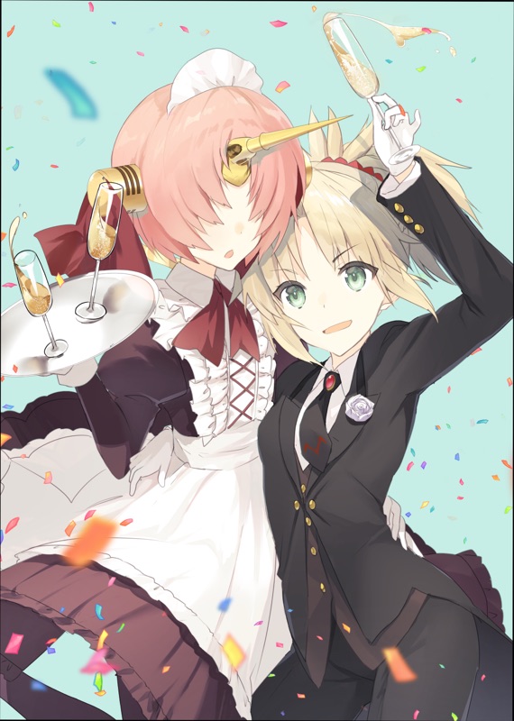 2girls apron aqua_background black_necktie black_pants black_suit blonde_hair butler champagne_flute confetti cowboy_shot crossdressing_(ftm) cup drinking_glass eka_eri fate/grand_order fate_(series) female_butler flower formal_clothes frankenstein's_monster_(fate) frankenstein's_monster_(formal_dress)_(fate) frills gloves green_eyes hair_over_eyes horns maid_headdress mechanical_horns mordred_(fate) mordred_(fate/apocrypha) mordred_(formal_dress)_(fate) multiple_girls necktie official_alternate_costume pants pink_hair ponytail rose short_hair simple_background sketch smile suit tray white_apron white_flower white_gloves white_rose