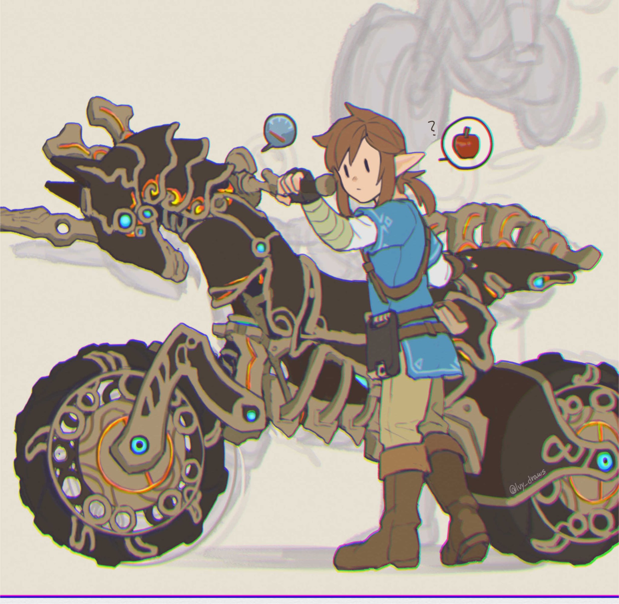 1boy apple blue_shirt brown_gloves brown_hair brown_pants fingerless_gloves food fruit gloves highres ivy_(sena0119) link long_sleeves male_focus master_cycle medium_hair motor_vehicle motorcycle nintendo pants pointy_ears ponytail shirt solo standing the_legend_of_zelda the_legend_of_zelda:_breath_of_the_wild