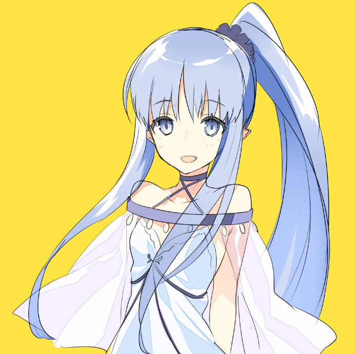 1girl :d bare_shoulders blue_eyes blue_hair choker commentary criss-cross_halter dress eka_eri fate/grand_order fate_(series) halterneck light_blue_hair long_hair looking_at_viewer magical_girl medea_(fate) medea_lily_(fate) off_shoulder open_mouth pointy_ears ponytail purple_choker simple_background smile solo strapless strapless_dress upper_body white_dress yellow_background