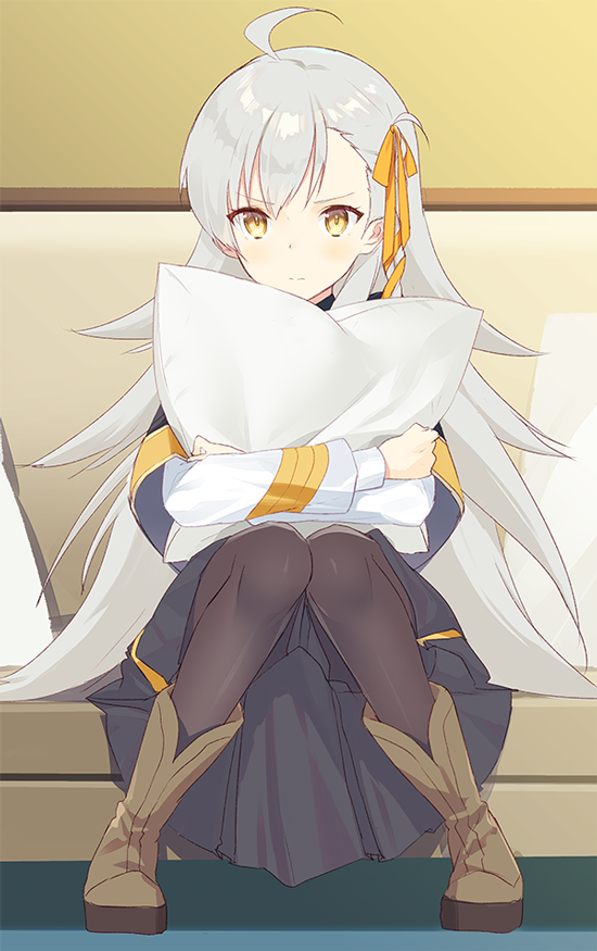 1girl aged_down ahoge asymmetrical_bangs black_pantyhose black_skirt boots brown_boots closed_mouth couch eka_eri fate_(series) hair_ribbon hugging_object long_hair long_sleeves looking_at_viewer lord_el-melloi_ii_case_files olga_marie_animusphere pantyhose pillow pillow_hug ribbon sitting skirt solo white_hair yellow_eyes yellow_ribbon