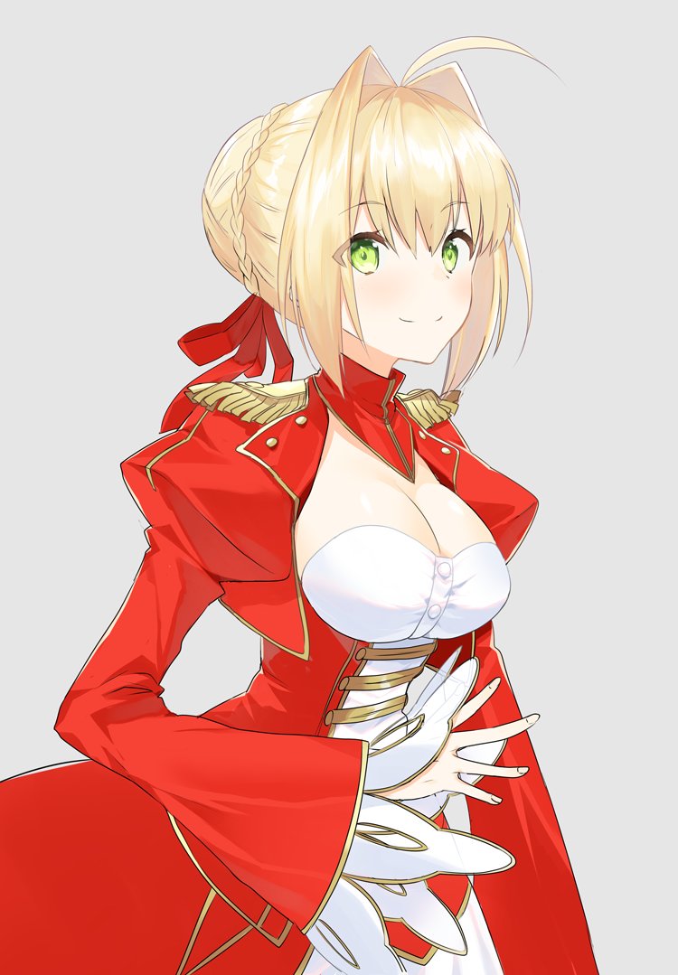 1girl blonde_hair blush braid breasts bun_with_braided_base cleavage closed_mouth dress eka_eri epaulettes fate/extra fate_(series) green_eyes grey_background hair_between_eyes hair_bun hair_intakes hair_ribbon juliet_sleeves long_sleeves looking_at_viewer medium_breasts nero_claudius_(fate) nero_claudius_(fate/extra) puffy_sleeves red_dress red_ribbon ribbon simple_background smile solo upper_body wide_sleeves