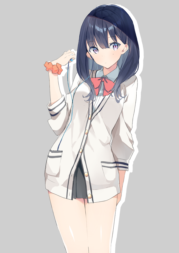 1girl arm_behind_back bare_legs black_skirt blue_hair bow bowtie cardigan closed_mouth collared_shirt dark_blue_hair earbuds earphones eka_eri feet_out_of_frame grey_background gridman_universe holding holding_earphones long_sleeves looking_at_viewer medium_hair miniskirt orange_scrunchie outline partially_unbuttoned purple_eyes red_bow red_bowtie scrunchie shirt simple_background single_earphone_removed skirt solo ssss.gridman takarada_rikka white_cardigan white_outline white_shirt wrist_scrunchie