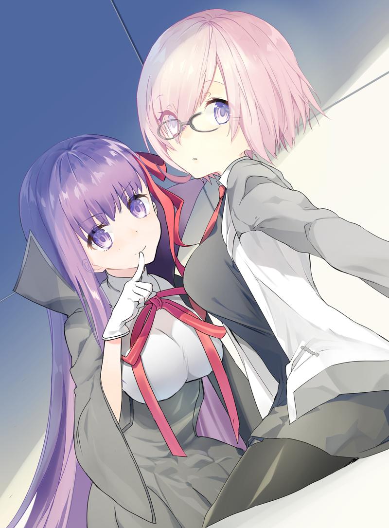 2girls bb_(fate) bb_(fate/extra) breasts coat dutch_angle eka_eri fate/extra fate/grand_order fate_(series) glasses gloves grey_coat grey_jacket grey_skirt hair_over_one_eye hair_ribbon high-waist_skirt jacket large_breasts long_sleeves looking_at_viewer mash_kyrielight multicolored_jacket multiple_girls neck_ribbon necktie open_clothes open_jacket parted_lips pink_hair purple_eyes purple_hair red_necktie red_ribbon ribbon short_hair skirt smile two-tone_jacket white_gloves white_jacket wide_sleeves