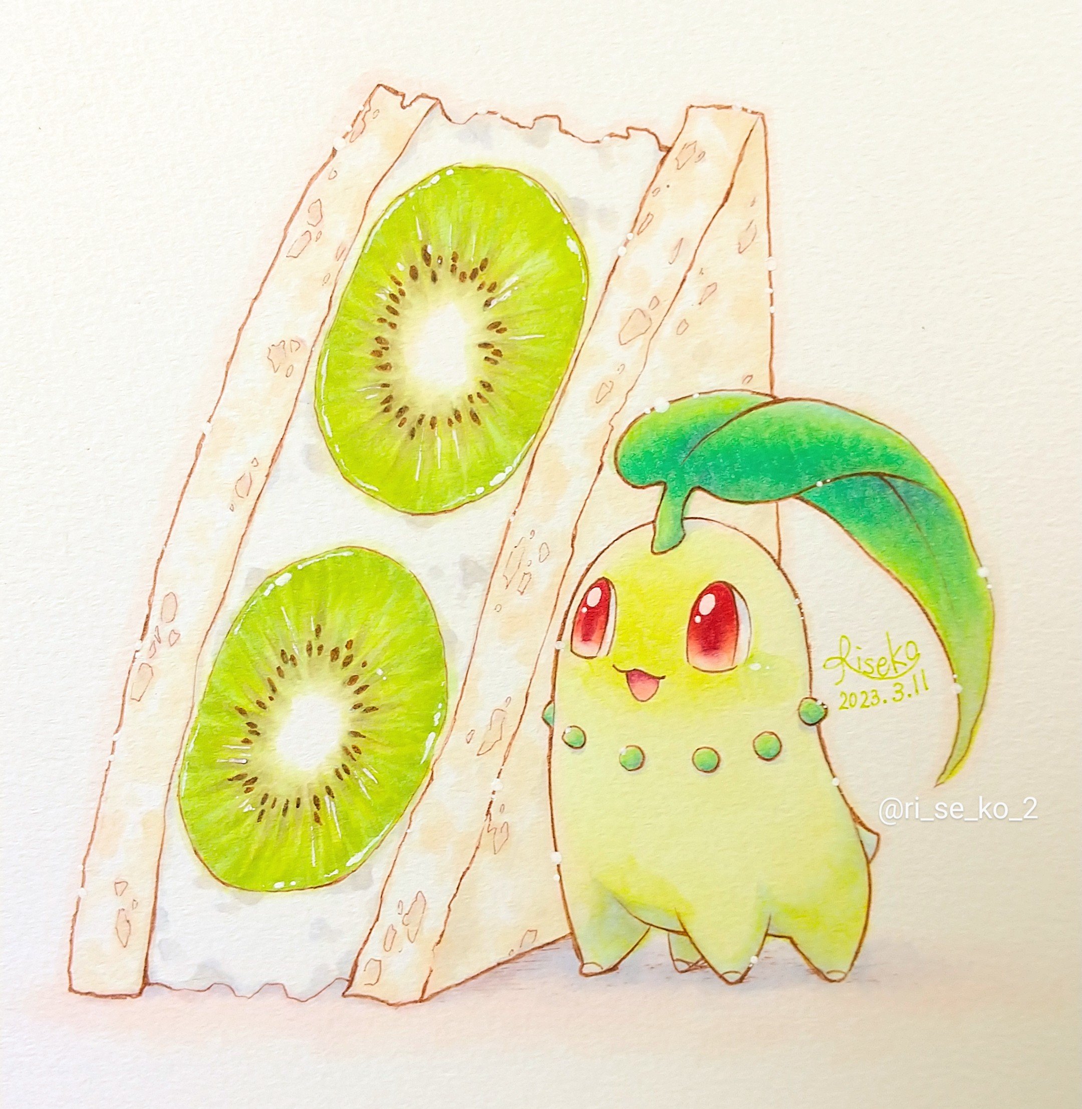 :3 :d artist_name chikorita commentary_request dated food fruit fruit_sandwich gen_2_pokemon highres kiwi_(fruit) kiwi_slice leaf nintendo no_humans open_mouth pokemon pokemon_(creature) red_eyes riseko_(rsk6025) sandwich signature simple_background smile traditional_media twitter_username white_background