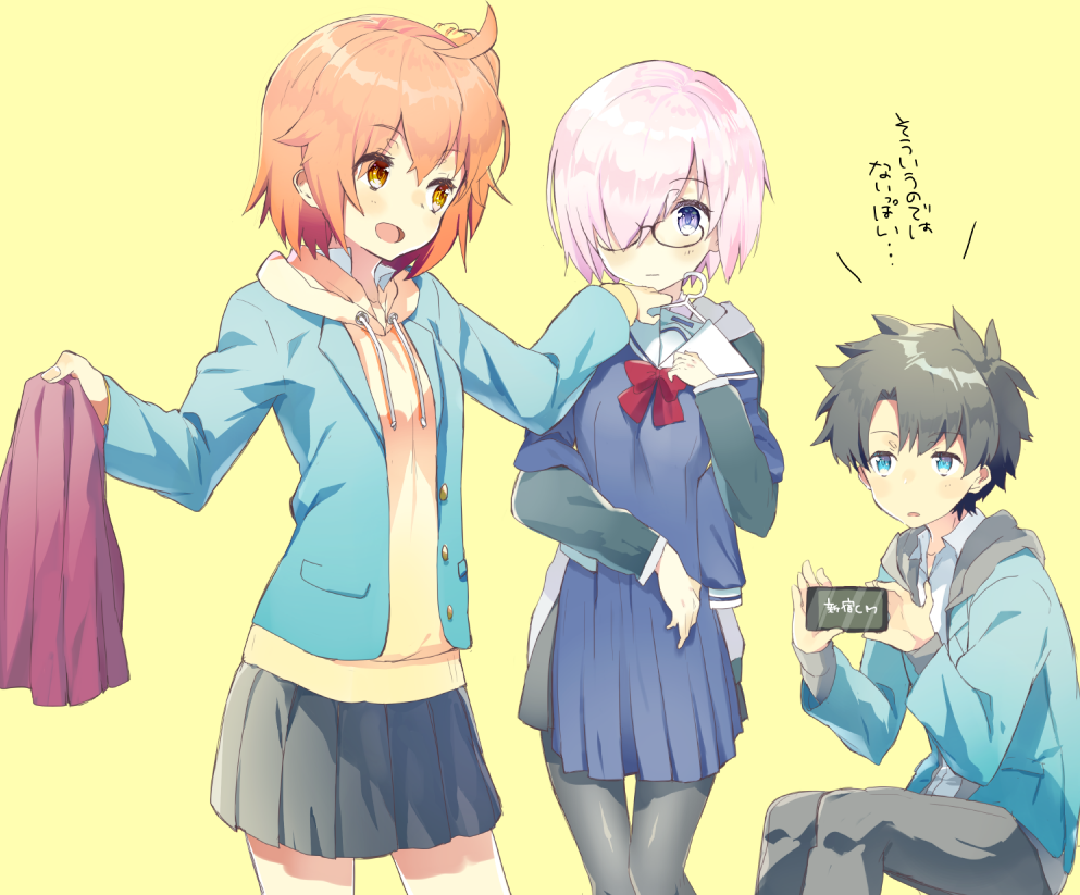 1boy 2girls ahoge alternate_costume black_hair black_pants black_pantyhose black_skirt blazer blue_eyes blue_hoodie blue_jacket blue_skirt blush casual cellphone clothes_hanger collared_shirt eka_eri fate/grand_order fate_(series) fujimaru_ritsuka_(female) fujimaru_ritsuka_(male) fujimaru_ritsuka_(male)_(morning_glory) hair_over_one_eye holding holding_clothes_hanger holding_phone holding_unworn_clothes holding_unworn_skirt hood hood_down hoodie jacket long_sleeves looking_at_another mash_kyrielight multiple_girls open_mouth orange_eyes orange_hair pants pantyhose phone pink_hair pleated_skirt purple_eyes shirt short_hair simple_background skirt smartphone smile translation_request unworn_clothes unworn_skirt white_shirt yellow_background yellow_hoodie