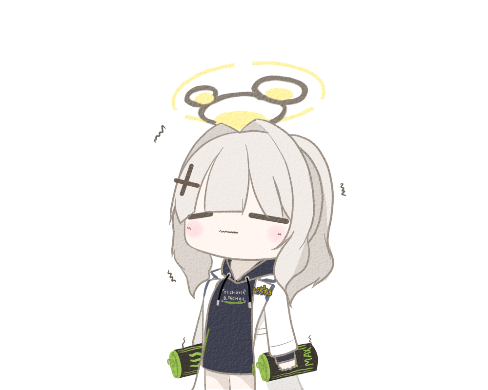 1girl black_hoodie blue_archive blush chibi closed_eyes cross_hair_ornament energy_drink hair_ornament halo hare_(blue_archive) hood hoodie koti lab_coat monster_energy simple_background solo trembling wavy_mouth white_background white_hair x_hair_ornament