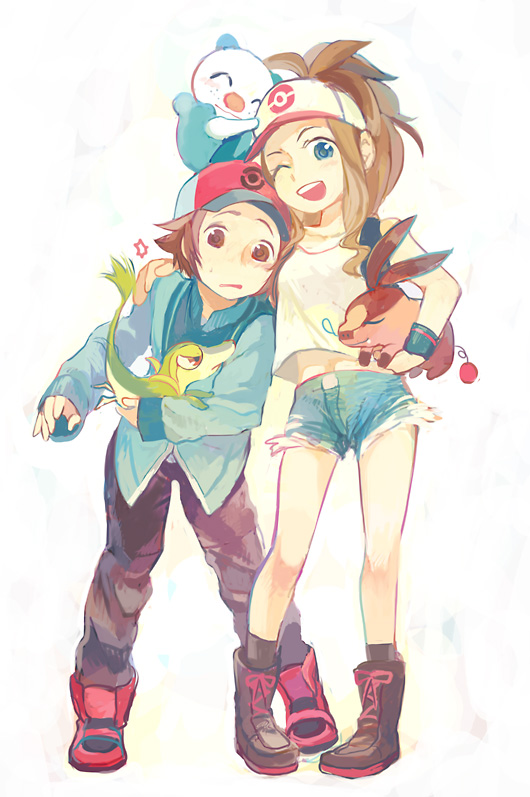 1boy 1girl baseball_cap black_socks black_vest blue_eyes blue_jacket boots brown_eyes brown_hair collarbone creature denim denim_shorts exposed_pocket gen_5_pokemon grey_pants hand_on_another's_shoulder hat hilbert_(pokemon) hilda_(pokemon) holding holding_creature jacket long_hair long_sleeves nintendo nose_bubble one_eye_closed open_mouth oshawott pants pepepe_(pixiv44901) poke_ball_print pokemon pokemon_black_and_white ponytail red_footwear red_headwear shirt shoes short_hair short_shorts shorts sleeveless sleeveless_shirt snivy socks star_(symbol) starter_pokemon_trio teeth tepig upper_teeth_only vest white_background white_headwear white_shirt