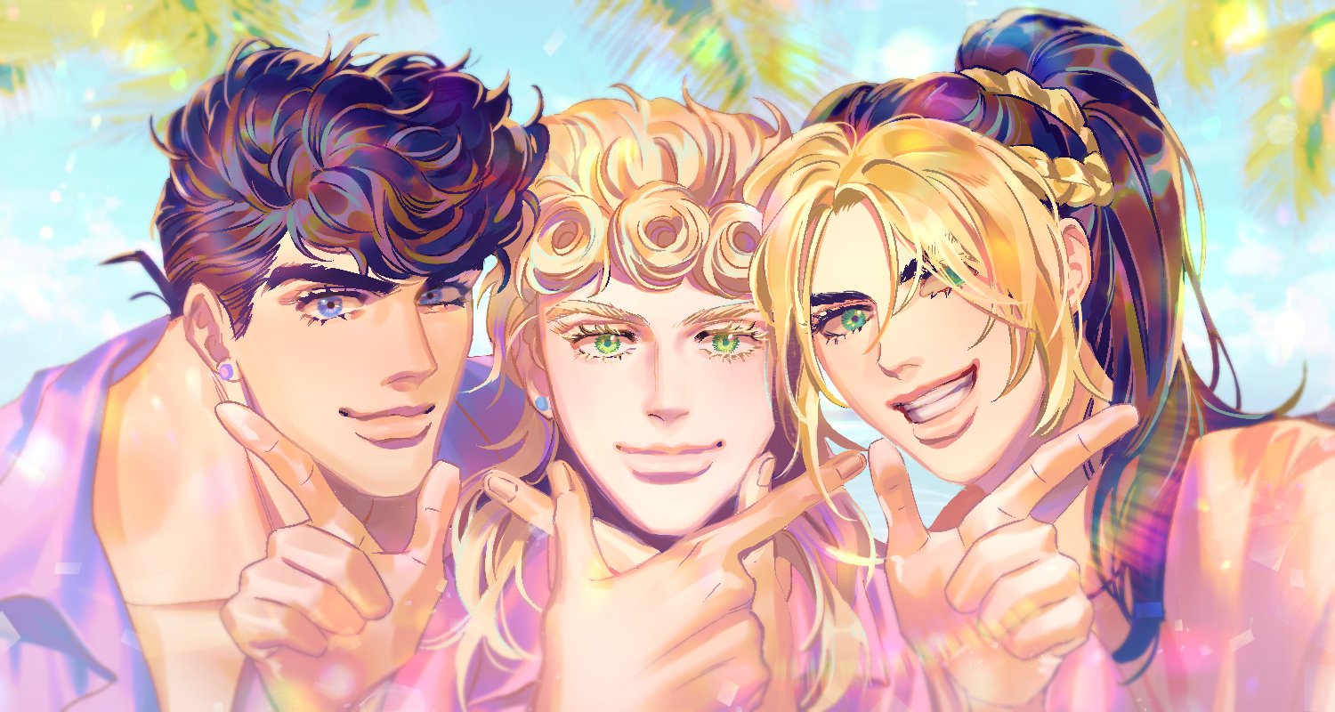 1girl 2boys beach black_hair blonde_hair blue_eyes closed_mouth commentary_request day diamond_wa_kudakenai earrings fingernails giorno_giovanna green_eyes grin higashikata_josuke jewelry jojo_no_kimyou_na_bouken korean_commentary kuujou_jolyne lemona633 lips long_hair looking_at_viewer multicolored_hair multiple_boys outdoors palm_tree pompadour ponytail smile tree two-tone_hair vento_aureo