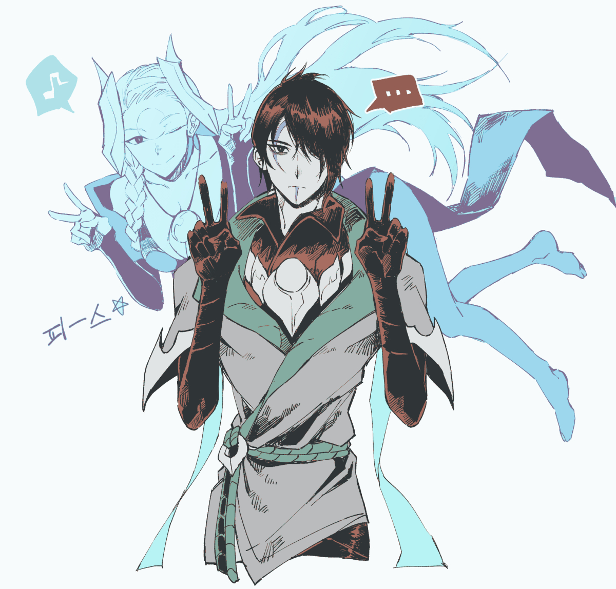 ... 1boy 1girl alune_(league_of_legends) aphelios black_eyes braid breasts brother_and_sister brown_hair closed_mouth collarbone commentary_request cropped_torso double_v elbow_gloves facial_mark gloves grey_background hair_over_one_eye hands_up large_breasts league_of_legends liv_(libeu) long_hair short_hair short_sleeves siblings simple_background speech_bubble spoken_ellipsis v