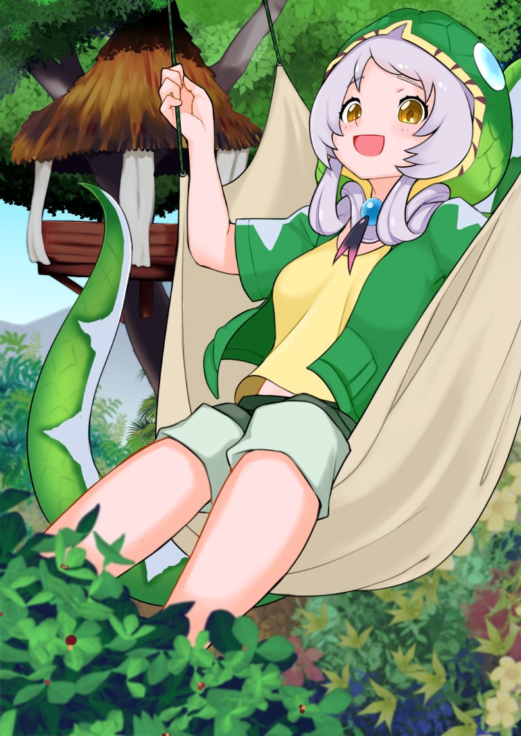 1girl blush emerald_tree_boa_(kemono_friends) green_hood green_jacket green_shorts grey_hair hair_rings hammock hood hood_up illu_(illu_stratos) jacket kemono_friends looking_at_viewer open_clothes open_jacket open_mouth pants pants_rolled_up shirt short_hair short_sleeves shorts smile snake_tail solo tail tree treehouse yellow_eyes yellow_shirt