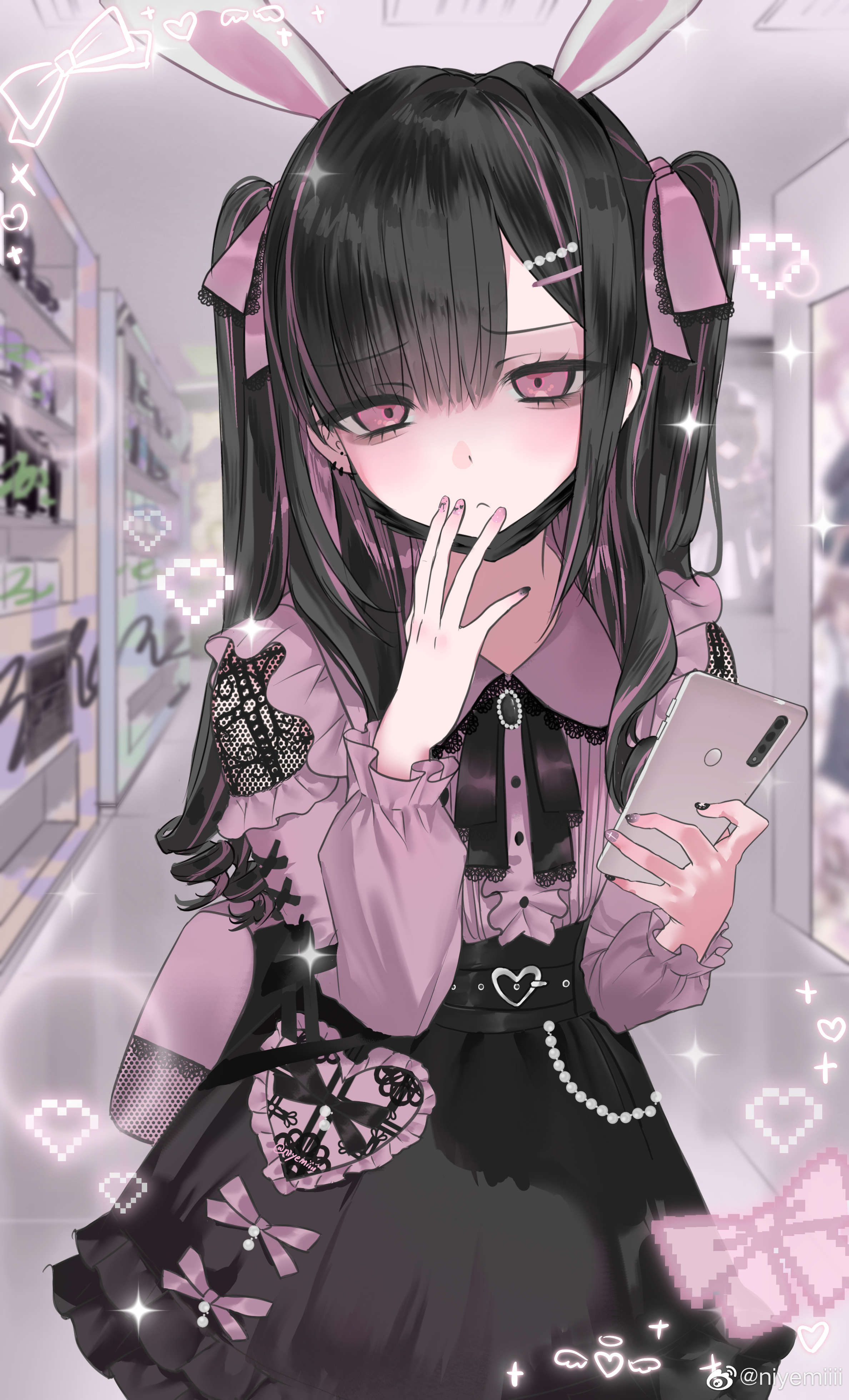 1girl absurdres annoyed black_gem black_hair black_nails blunt_bangs closed_mouth frilled_sleeves frills frown gem glint hair_ornament hairclip half_updo heart heart_hair_ornament highres lace light_particles long_hair looking_at_viewer multicolored_hair niyemiiii original pearl_(gemstone) pearl_hair_ornament pout purple_hair solo sparkle straight_hair twintails two-tone_hair two_side_up v-shaped_eyebrows
