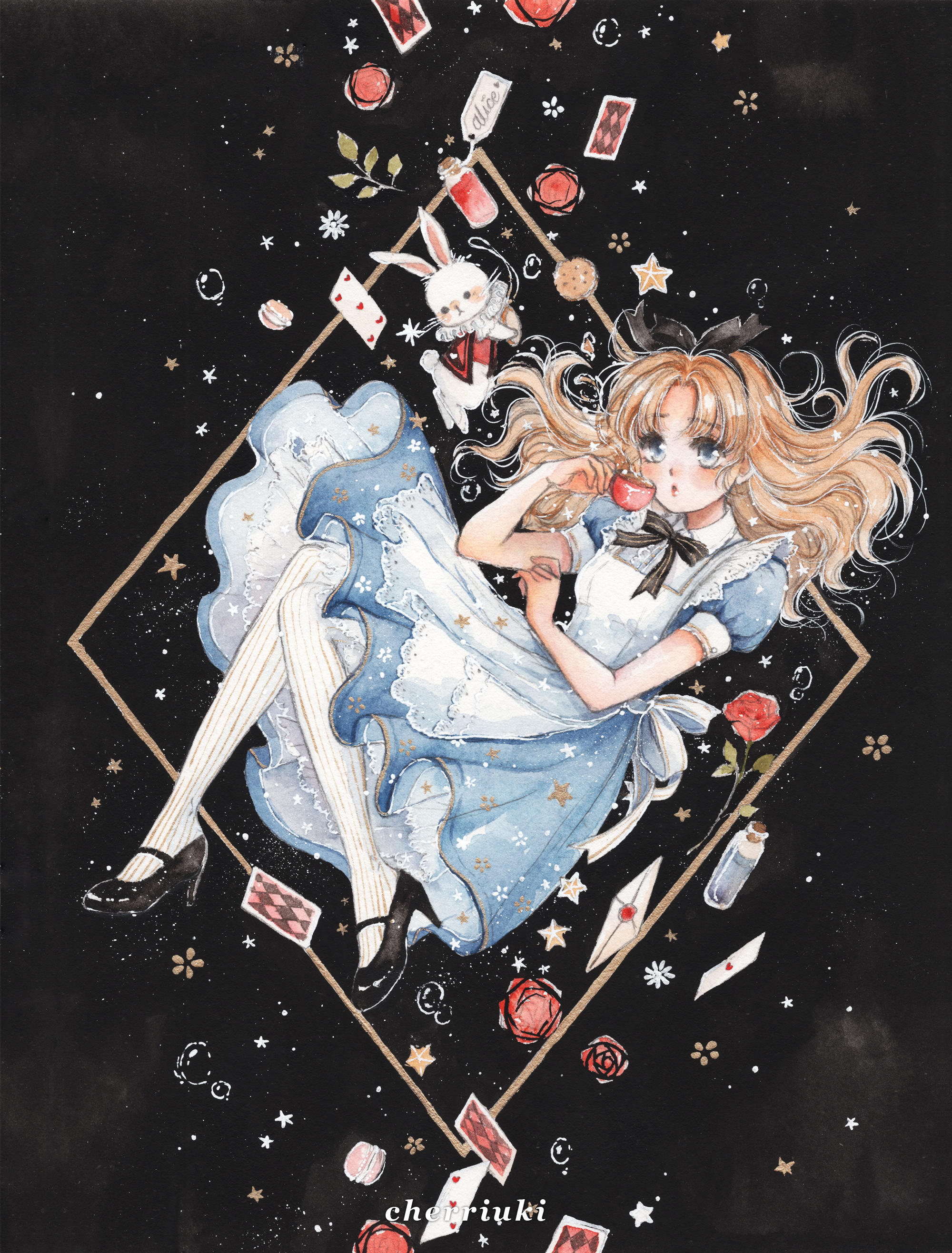 1girl absurdres ace_(playing_card) ace_of_hearts alice_(alice_in_wonderland) alice's_adventures_in_wonderland black_bow black_footwear blue_dress bow card cherriuki cookie cup dress envelope falling five_of_hearts flower food grey_eyes heart highres holding holding_cup painting_(medium) pantyhose playing_card rabbit red_flower red_rose rose star_(symbol) striped_clothes striped_pantyhose teacup three_of_hearts traditional_media vertical-striped_clothes vertical-striped_pantyhose vial watercolor_(medium) white_flower white_pantyhose white_rabbit_(alice_in_wonderland)