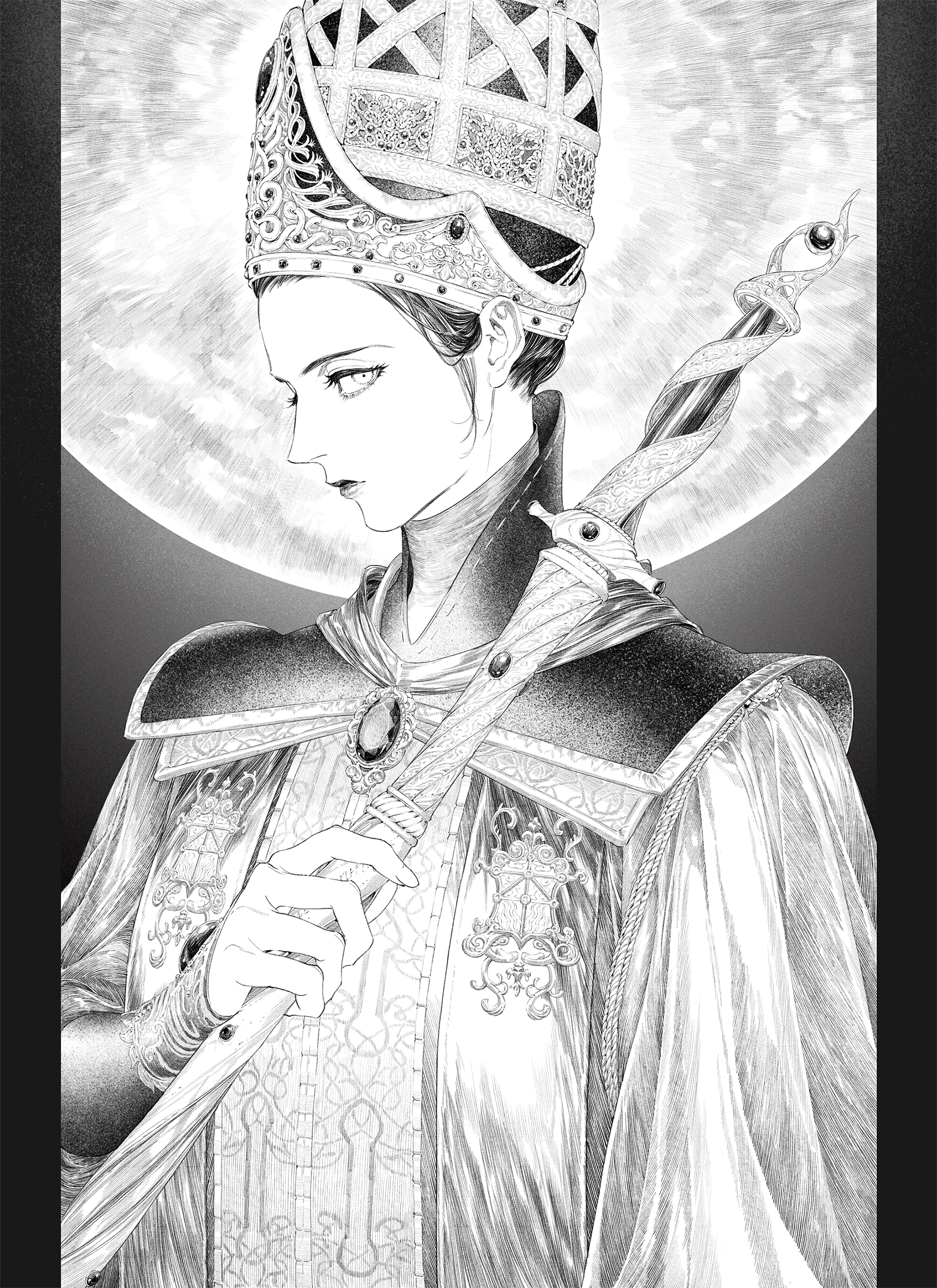 1girl absurdres brooch closed_mouth elden_ring greyscale hand_up headwear_request highres holding holding_staff jewelry looking_at_viewer mizuya monochrome moon pillarboxed rennala_queen_of_the_full_moon robe short_hair solo staff