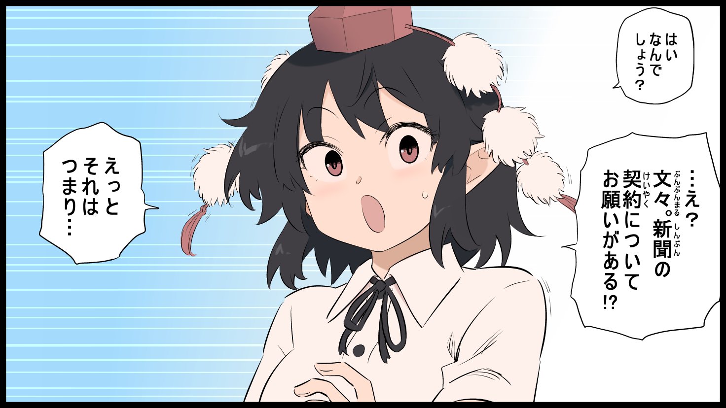 1girl :o black_hair black_ribbon collared_shirt hat neck_ribbon open_mouth pointy_ears pom_pom_(clothes) red_eyes red_hat ribbon shameimaru_aya shirt short_hair short_sleeves shundou_heishirou solo surprised tassel tokin_hat touhou translation_request upper_body white_shirt