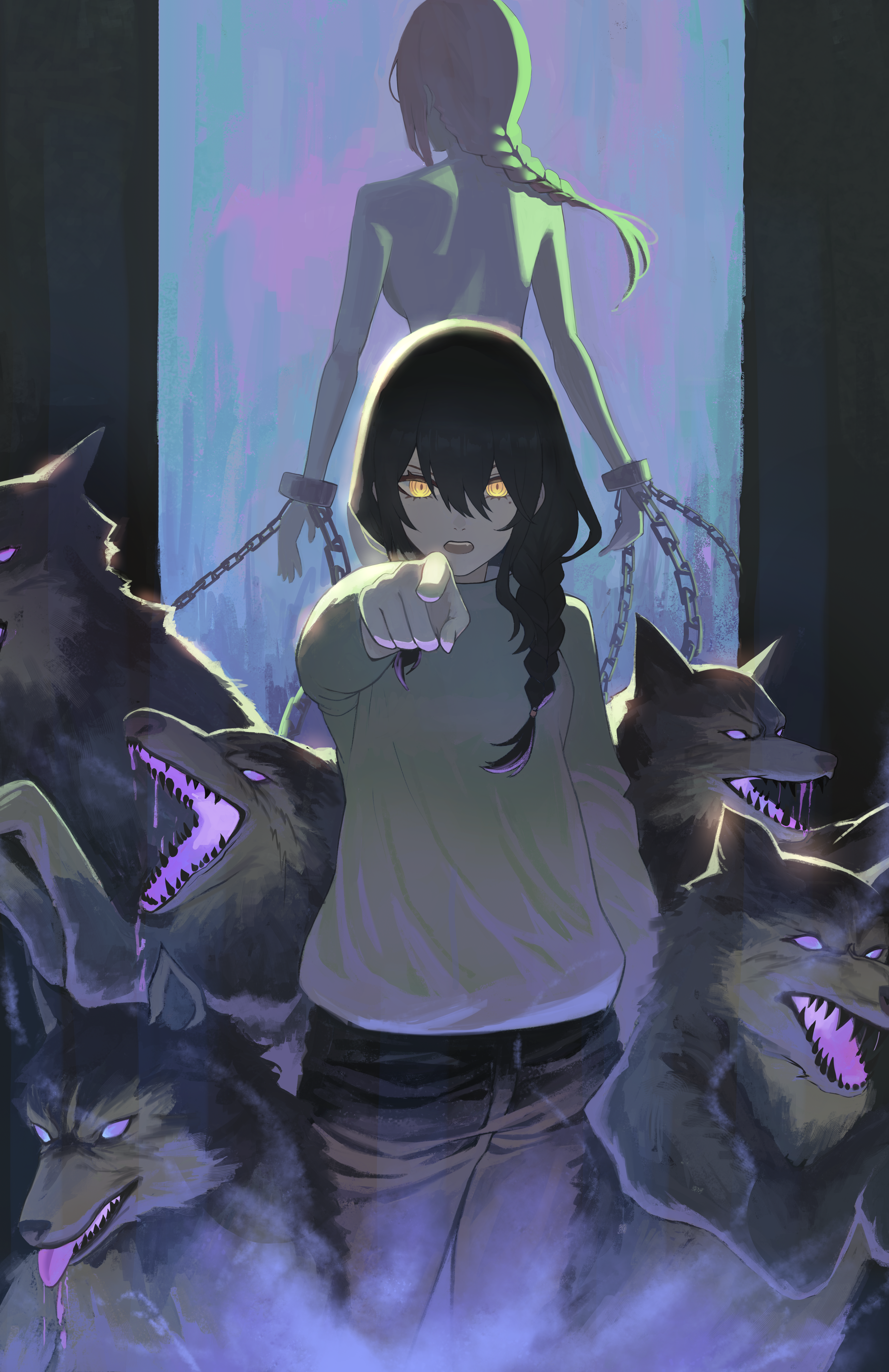 2girls absurdres animal black_hair braid braided_ponytail chainsaw_man cuffs grey_sweater hair_over_shoulder highres looking_at_viewer makima_(chainsaw_man) medium_hair multiple_girls nayuta_(chainsaw_man) nude open_mouth oro_(lsg0624) pointing pointing_at_viewer purple_theme ringed_eyes shackles sharp_teeth short_hair sweater sweater_tucked_in teeth wolf yellow_eyes