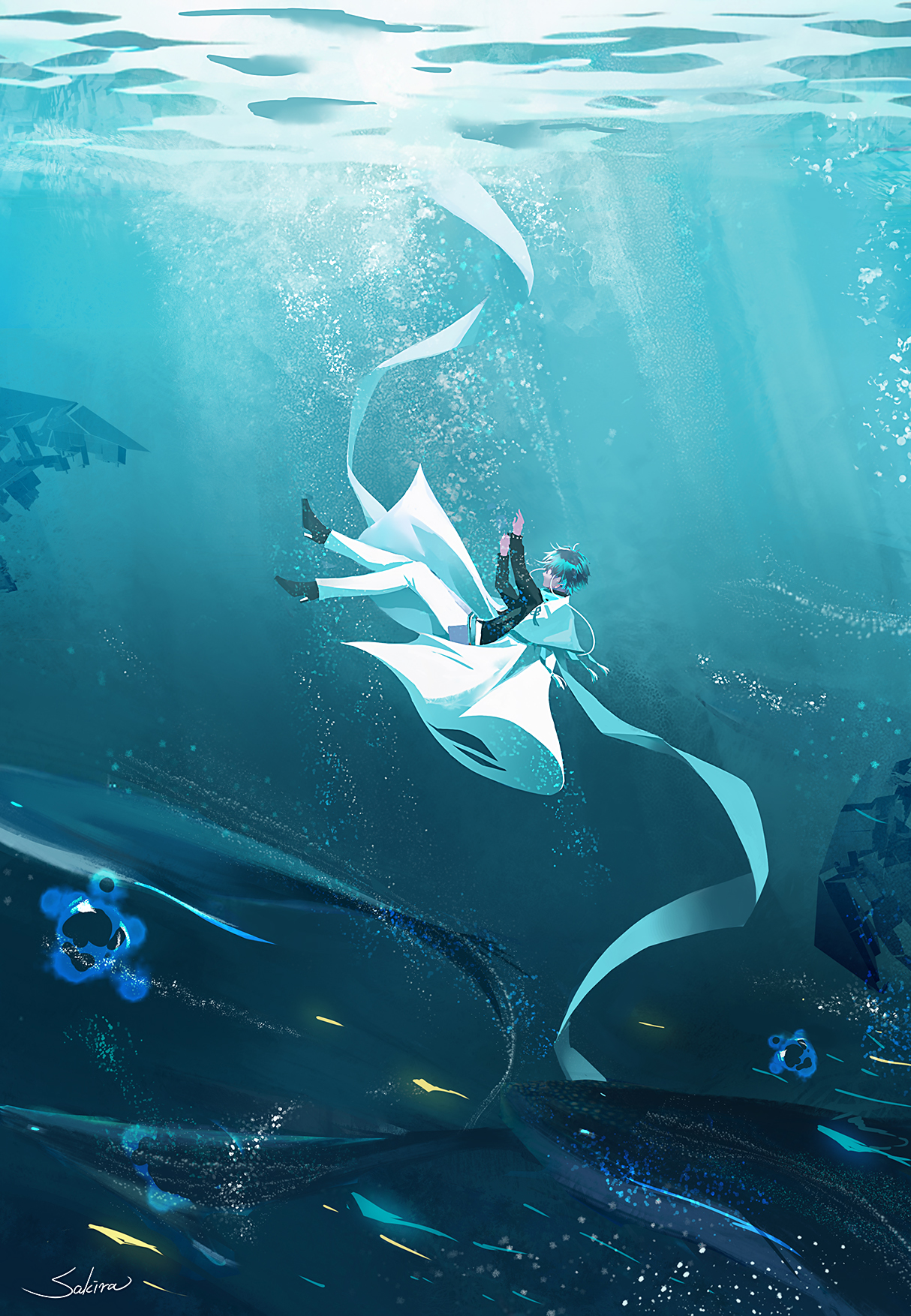 1boy black_footwear blue_hair blue_theme bubble caustics eyewear_strap from_side high_heels highres ike_eveland ike_eveland_(1st_costume) jacket long_sleeves male_focus nijisanji nijisanji_en pants sakira_cai short_hair signature solo underwater virtual_youtuber white_jacket white_pants wide_shot