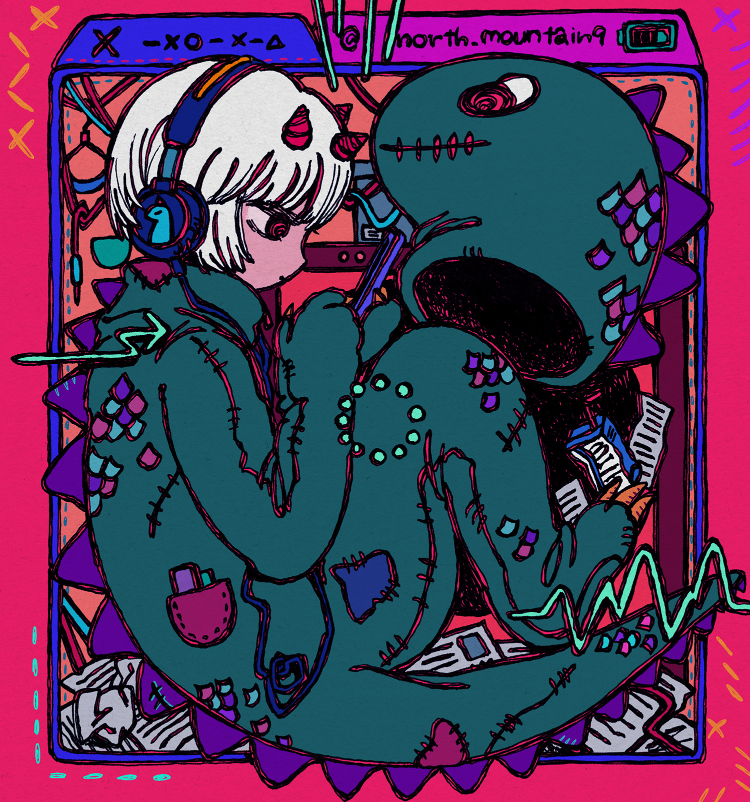 1girl animal_costume battery_indicator cable cellphone dinosaur_costume drink_carton flat_color from_side headphones highres holding holding_phone horns juice_box knees_up looking_at_object looking_at_phone mascot_costume mascot_head mitsuno_(northeast_mountain) multiple_horns original paper phone profile red_eyes short_hair sitting smartphone solo white_hair window_(computing) yamakita_higashi