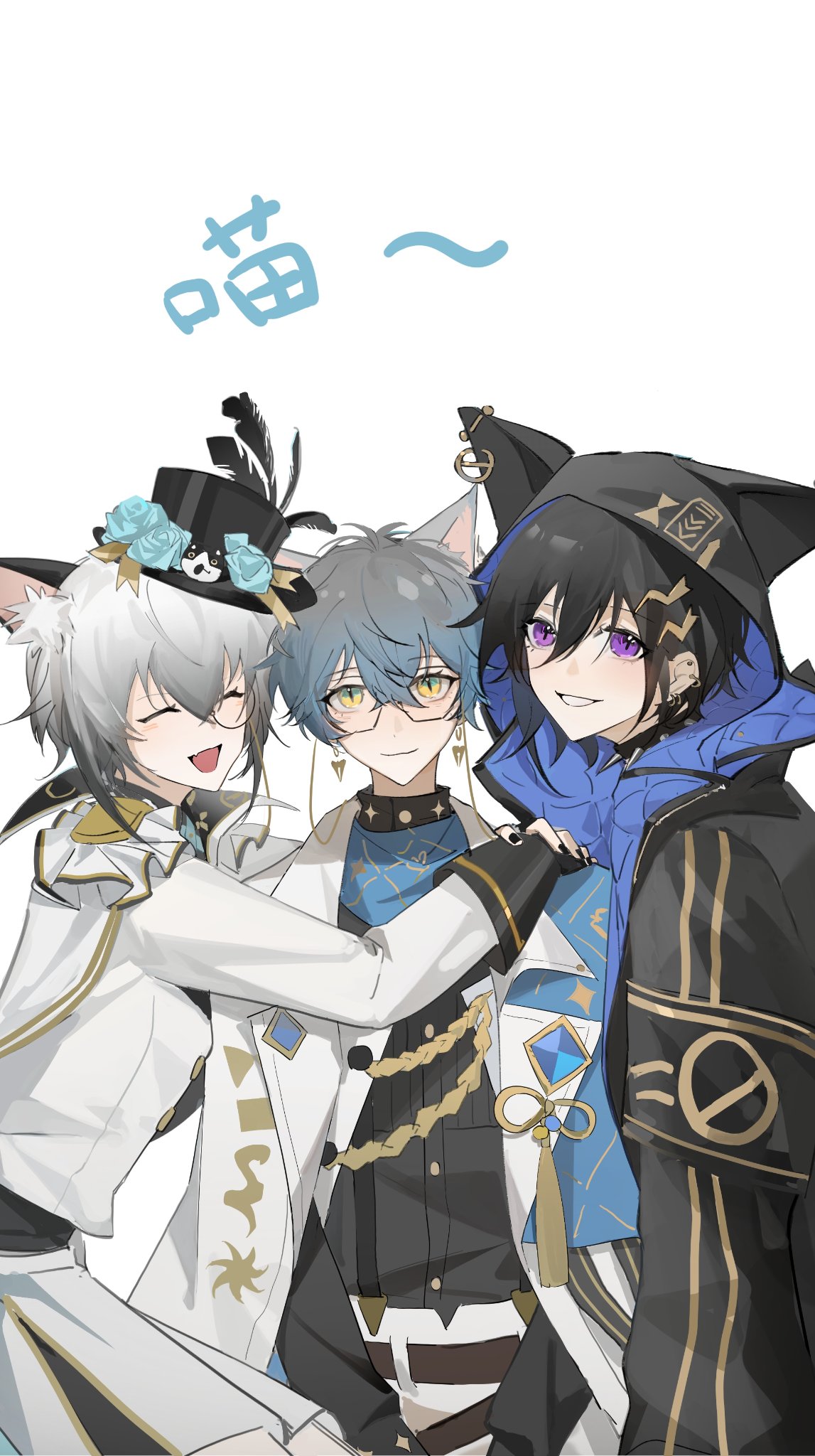 1girl 2boys animal_ear_fluff animal_ears animal_hood belt black_hair black_jacket black_nails black_shirt blue_capelet blue_hair breasts brown_belt capelet cat_ears cat_hood closed_eyes crossed_bangs epaulettes eyewear_strap fake_animal_ears fang flower glasses gradient_hair green_eyes grey_hair hair_between_eyes hair_ornament hat hat_feather hat_flower highres holostars hood hood_up ike_eveland ike_eveland_(1st_costume) jacket kanade_izuru kemonomimi_mode lightning_bolt lightning_bolt_hair_ornament lightning_bolt_symbol long_sleeves looking_at_viewer mini_hat mini_top_hat monocle multicolored_eyes multicolored_hair multiple_boys nekozeno_shin nijisanji nijisanji_en noripro open_mouth padded_jacket pants purple_eyes round_eyewear shirt short_hair skin_fang small_breasts smile song_(v3wm9a701fvqjxf) suspenders top_hat turtleneck two-sided_fabric two-sided_jacket virtual_youtuber white_capelet white_jacket white_pants yellow_eyes
