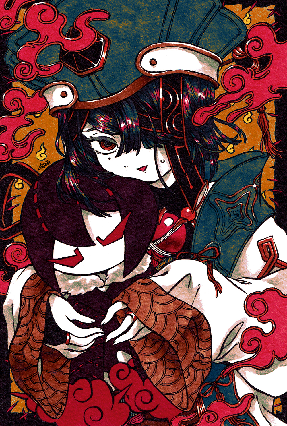1girl asymmetrical_bangs bridal_gauntlets character_doll chinese_clothes clothing_request doll fate/grand_order fate_(series) hair_over_one_eye hat highres holding holding_doll limited_palette long_sleeves mole mole_under_eye parted_lips red_eyes short_hair sleeves_past_wrists smile solo stuffed_toy sweatdrop tassel upper_body xiangyun xu_fu_(fate) xu_fu_(first_ascension)_(fate) yamakita_higashi yu_mei-ren_(fate)