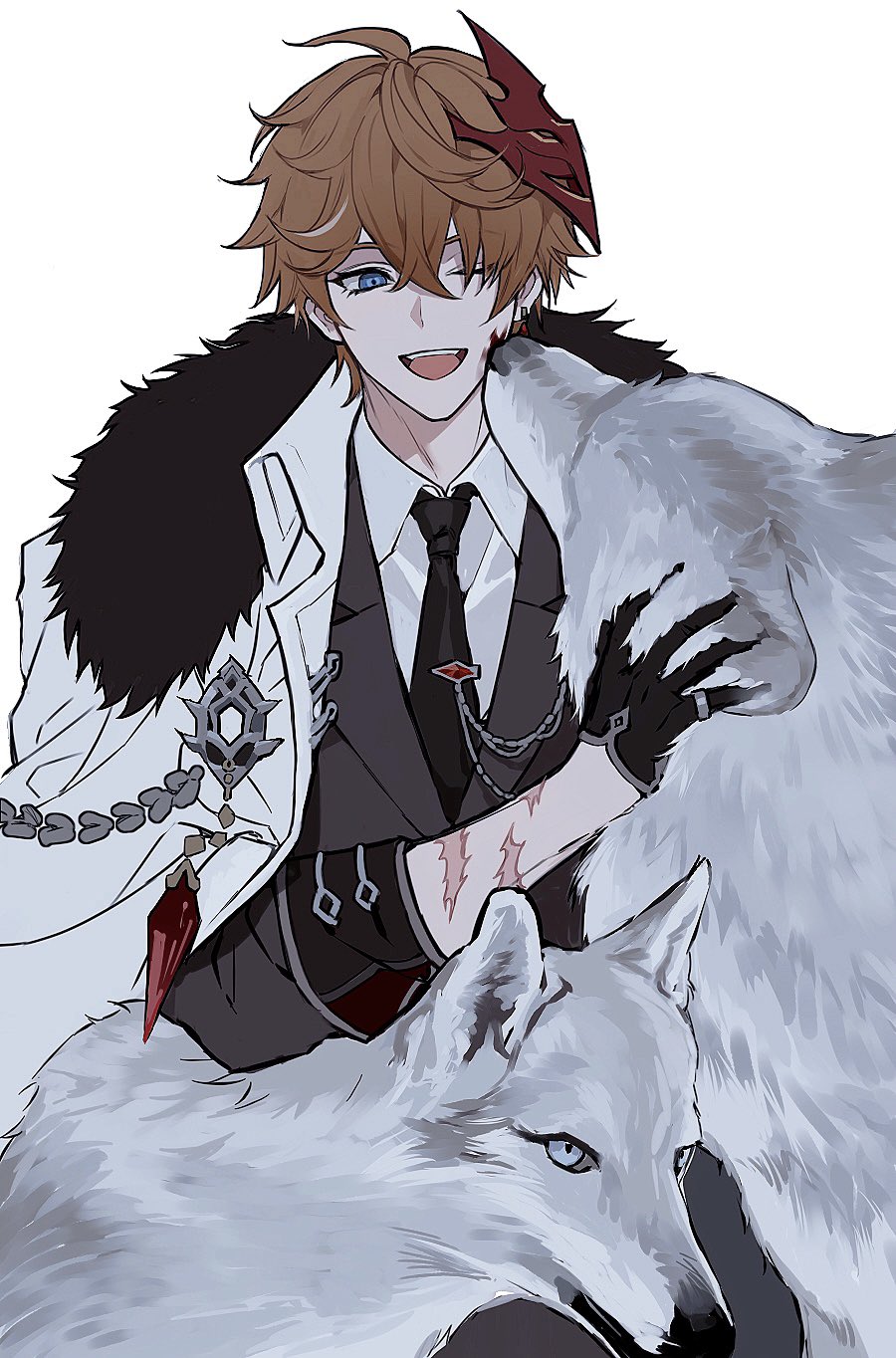 1boy ;d ahoge aiguillette black_gloves black_necktie blue_eyes brown_jacket coat coat_on_shoulders collared_coat collared_shirt commentary crossed_bangs earrings eyelashes fur-trimmed_coat fur_trim genshin_impact gloves hair_between_eyes hand_up highres hs_(otterheisi) jacket jewelry lapels long_sleeves looking_at_another male_focus mask mask_on_head necktie one_eye_closed open_mouth orange_hair scar scar_on_arm shirt short_hair simple_background single_earring smile solo untranslatable_commentary tartaglia_(genshin_impact) teeth upper_teeth_only white_background white_coat white_shirt wing_collar wolf