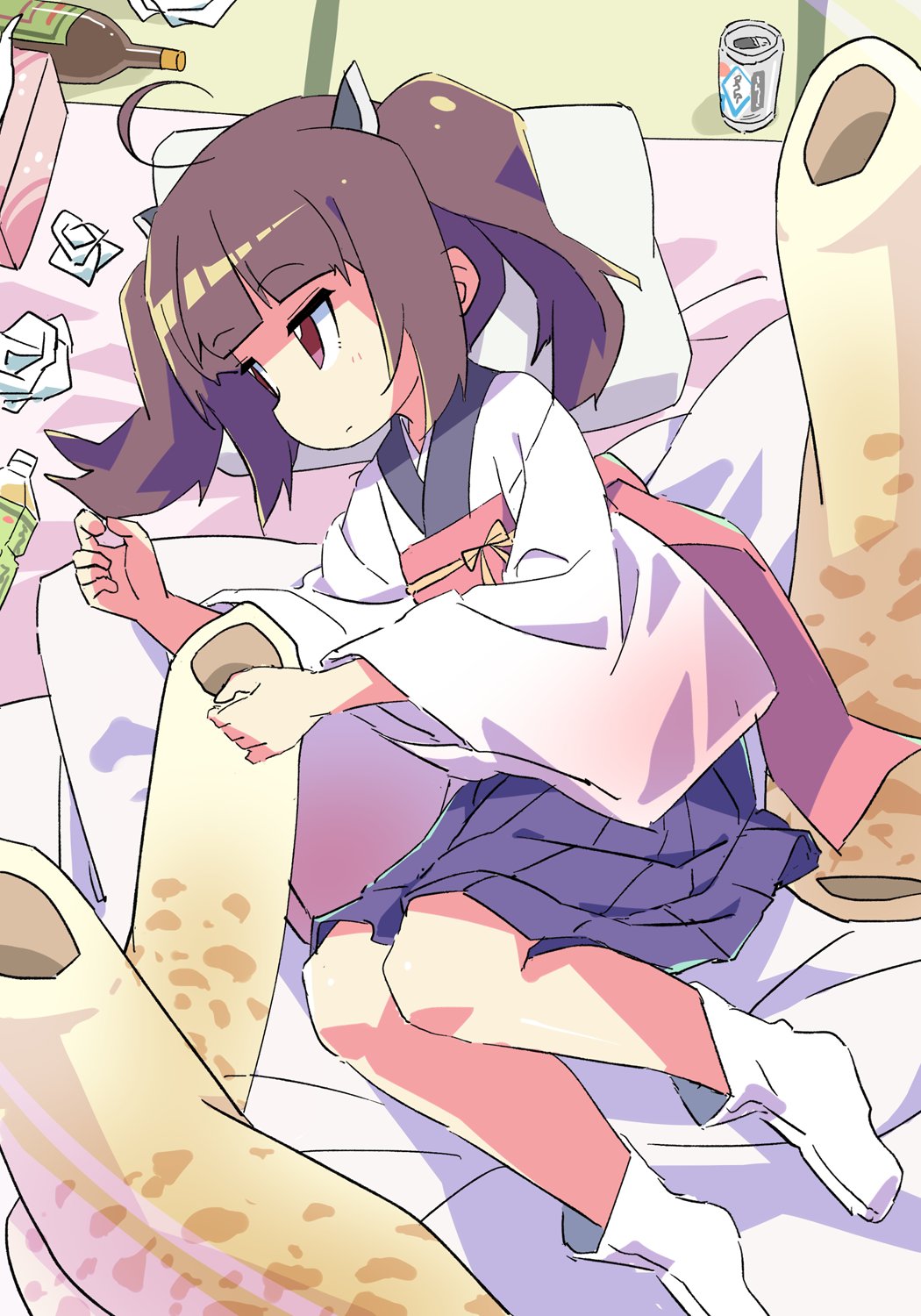 1girl ahoge blush bottle brown_hair can closed_mouth headgear highres japanese_clothes kimono kiritanpo_(food) long_sleeves looking_away lying no_shoes obi on_side pleated_skirt purple_skirt red_eyes roku_no_hito sash skirt socks solo tatami tissue_box touhoku_kiritan twintails used_tissue voiceroid white_kimono white_socks wide_sleeves