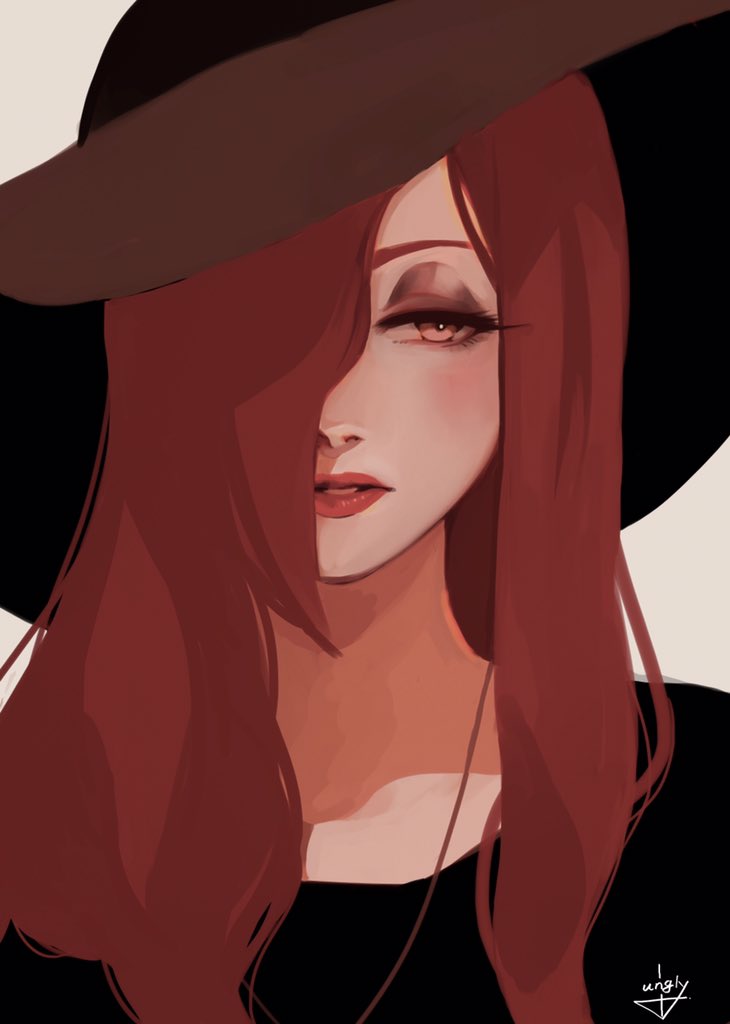 1girl eyeshadow hair_over_one_eye half-closed_eyes hat lipstick long_hair makeup parasoul_(skullgirls) parted_lips portrait red_hair red_lips skullgirls solo ungly