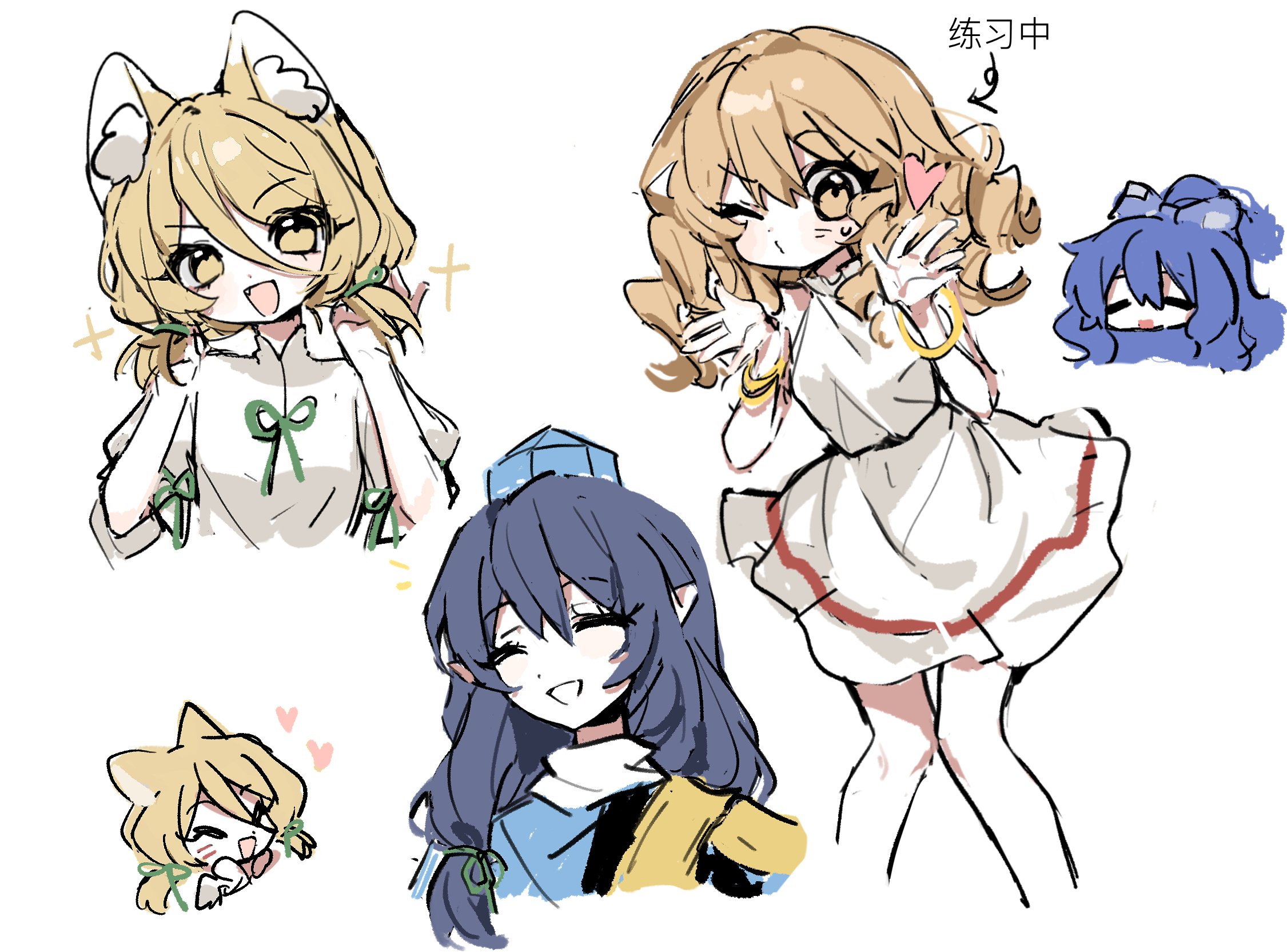 4girls :d ^_^ alternate_hairstyle blue_hair chibi closed_eyes cropped_legs dark_blue_hair drill_hair fang hands_up happy hat heart highres hood hoodie iizunamaru_megumu jewelry knees_together_feet_apart kudamaki_tsukasa low_twintails multiple_girls open_mouth pointy_ears pointy_hair siblings sisters sketch smile springarashi02 tokin_hat top_hat touhou twintails yorigami_jo'on yorigami_shion