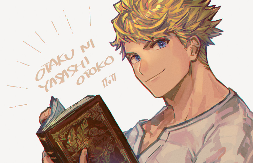 1boy blonde_hair book closed_mouth granblue_fantasy holding holding_book jhm_xyz looking_at_viewer male_focus open_book shirt short_hair simple_background smile solo upper_body vane_(granblue_fantasy) white_background white_shirt