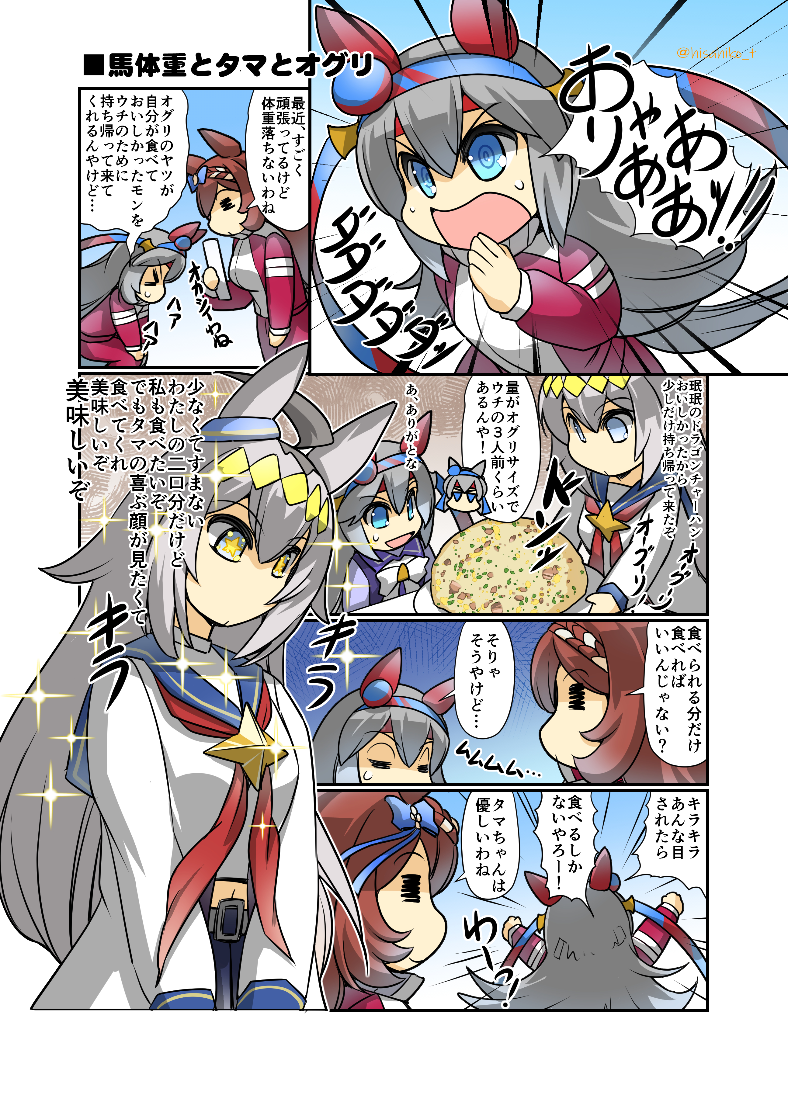 >_< 3girls =_= @_@ absurdres ahoge animal_ears arms_up belt blue_background blue_bow blue_eyes blue_flower blue_hairband blue_sailor_collar bow bowtie braid brown_hair chibi closed_eyes comic commentary_request ear_bow ear_ornament emphasis_lines flashback flower food fried_rice grey_hair hair_between_eyes hair_ornament hairband head_tilt headband highres hisahiko holding holding_plate horse_ears horse_girl horse_tail jacket kansaiben long_hair long_sleeves looking_down meme midriff_peek multicolored_hair multicolored_hairband multiple_girls navel neckerchief no_mouth oguri_cap_(umamusume) oguri_oguri_(meme) outside_border plate pleated_skirt purple_sailor_collar purple_shirt purple_skirt red_hairband red_headband red_jacket red_neckerchief remembering running sailor_collar sailor_shirt school_uniform screaming shirt shouting sidelocks skirt sound_effects sparkle speech_bubble star_(symbol) star_in_eye striped_clothes striped_hairband super_creek_(umamusume) sweat sweatdrop symbol_in_eye tail tamamo_cross_(umamusume) tracen_school_uniform track_jacket translation_request twitter_username two-tone_hair two-tone_hairband umamusume v-shaped_eyebrows very_long_hair white_bow white_bowtie white_hair winter_uniform yellow_hairband