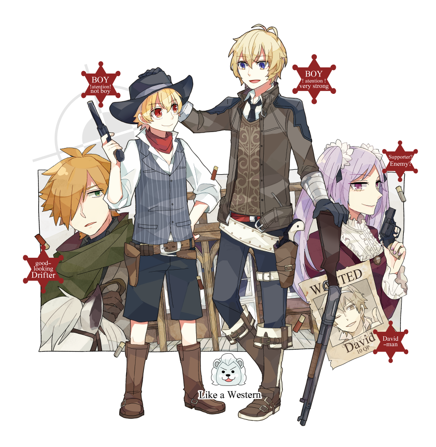 1girl 5boys billy_the_kid_(fate) black_gloves black_headwear black_pants black_shorts blonde_hair blue_eyes boots brown_footwear bullet character_name child_gilgamesh_(fate) cowboy cowboy_hat cowboy_western crosshair david_(fate) english_text engrish_text euryale_(fate) fate/grand_order fate_(series) gilgamesh_(fate) gloves green_eyes gun hair_over_one_eye hand_on_another's_head handgun hat holding holding_gun holding_weapon light_purple_hair multiple_boys one_eye_closed open_mouth orange_hair pants pink_eyes ranguage red_eyes rifle robin_hood_(fate) shirt shorts smile ss_ii_kk thomas_edison_(fate) twintails vest wanted_poster weapon western white_horse white_shirt