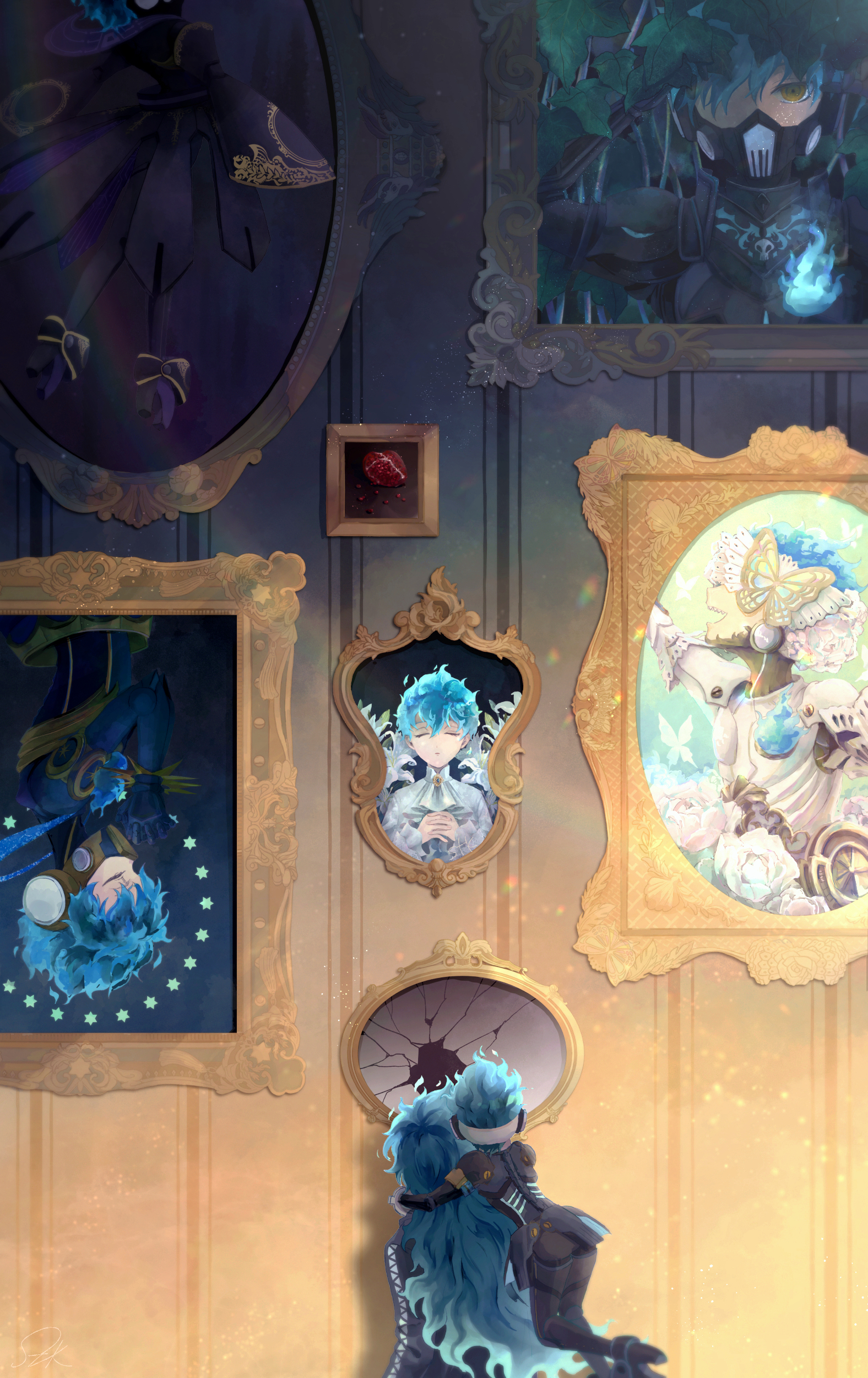 2boys absurdres behind-the-head_headphones blue_fire blue_hair blue_jacket broken_glass brothers bug butterfly facing_away fiery_hair fire floating flower food foot_out_of_frame from_behind fruit glass hair_between_eyes headphones highres hug hug_from_behind idia_shroud insect jacket joints long_hair male_focus mask mechabare multiple_boys ortho_shroud ortho_shroud_(fairy_gear) ortho_shroud_(halloween_gear) ortho_shroud_(stargazer_gear) picture_frame pomegranate portrait portrait_(object) respirator robot_joints rose satsuki_(zen05) short_hair siblings star_(symbol) twisted_wonderland upper_body wall white_flower white_rose yellow_eyes
