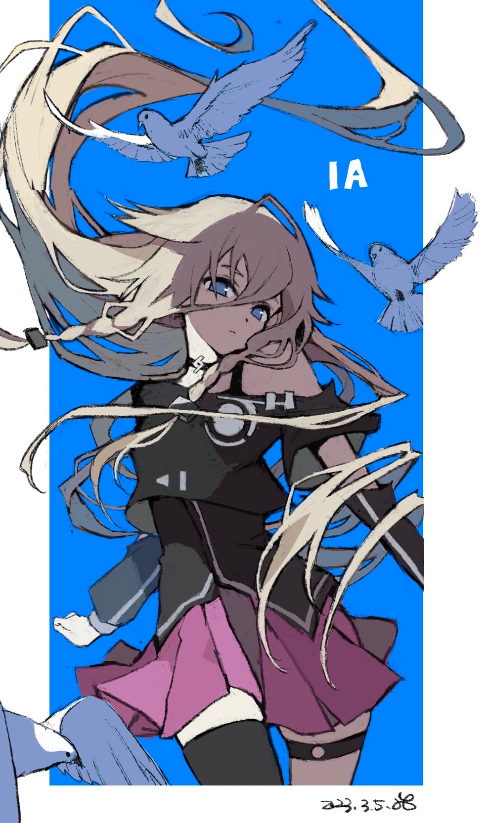 1girl arms_at_sides arms_up bird black_choker black_tank_top black_thighhighs blue_background blue_eyes border braid character_name choker closed_mouth contrapposto cowboy_shot crop_top dated dot_nose expressionless floating_hair grey_hair hair_between_eyes half-closed_eyes highres ia_(vocaloid) long_hair long_sleeves looking_at_viewer low_twin_braids ofgwr pink_skirt pleated_skirt shade sidelighting simple_background single_horizontal_stripe single_thighhigh single_vertical_stripe skirt solo spiked_hair tank_top thigh_gap thigh_strap thighhighs twin_braids very_long_hair vocaloid white_bird white_border