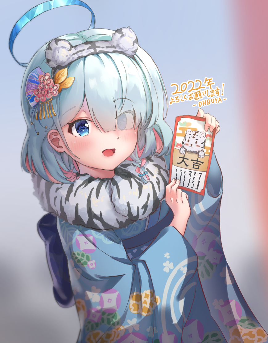 1girl 2022 :d alternate_costume animal_ears animal_print aqua_eyes aqua_hair arona_(blue_archive) blue_archive braid colored_inner_hair commentary_request fake_animal_ears fur_scarf hair_ornament hair_over_one_eye hairband halo holding holding_paper japanese_clothes kimono long_bangs long_sleeves looking_at_viewer multicolored_hair new_year ohbuya omikuji open_mouth paper short_hair sidelocks simple_background single_braid smile solo tiger_ears tiger_print two-tone_hair wide_sleeves
