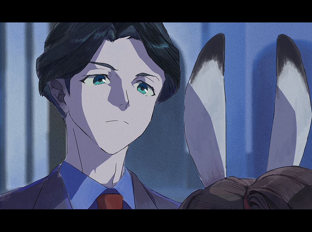 1boy 1girl andrew_hanbridge animal_ears blue_shirt blurry blurry_background brown_hair collared_shirt domdomtaico faceless faceless_female green_eyes hair_intakes jacket kagari_atsuko little_witch_academia male_focus necktie purple_jacket rabbit_ears red_necktie shirt solo_focus split_mouth