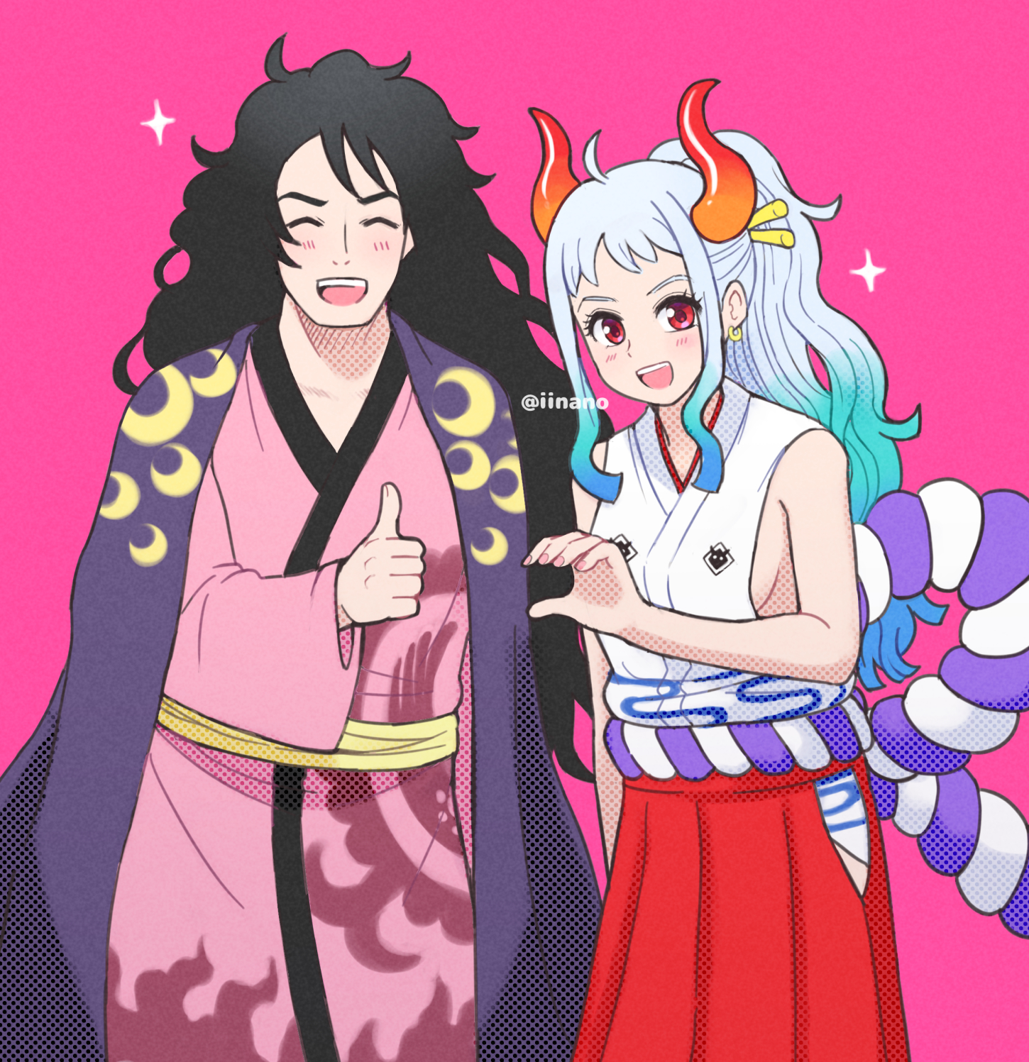 1boy 1girl artist_name blush closed_eyes earrings heart_hands_failure highres horns iinano_(inanosuke) japanese_clothes jewelry kouzuki_momonosuke long_hair looking_at_viewer multicolored_hair one_piece oni oni_horns open_mouth pink_background smile thumbs_up yamato_(one_piece)