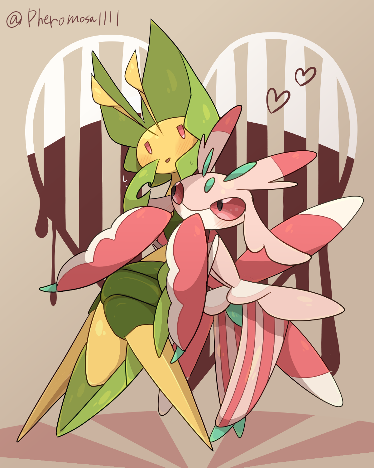 2girls a-nya antennae arthropod_girl artist_name black_eyes blank_eyes blush brown_background colored_sclera colored_skin female_focus flying_sweatdrops full_body furry furry_female furry_with_furry gen_5_pokemon gen_7_pokemon green_skin half-closed_eyes hand_to_own_mouth hand_up heart heart_background highres hug hug_from_behind interspecies leaning_back leaning_forward leavanny looking_at_another lurantis multicolored_skin multiple_girls nintendo no_mouth pink_skin pokemon pokemon_(creature) red_eyes red_sclera signature standing striped_skin sweat twitter_username white_skin yellow_skin yuri
