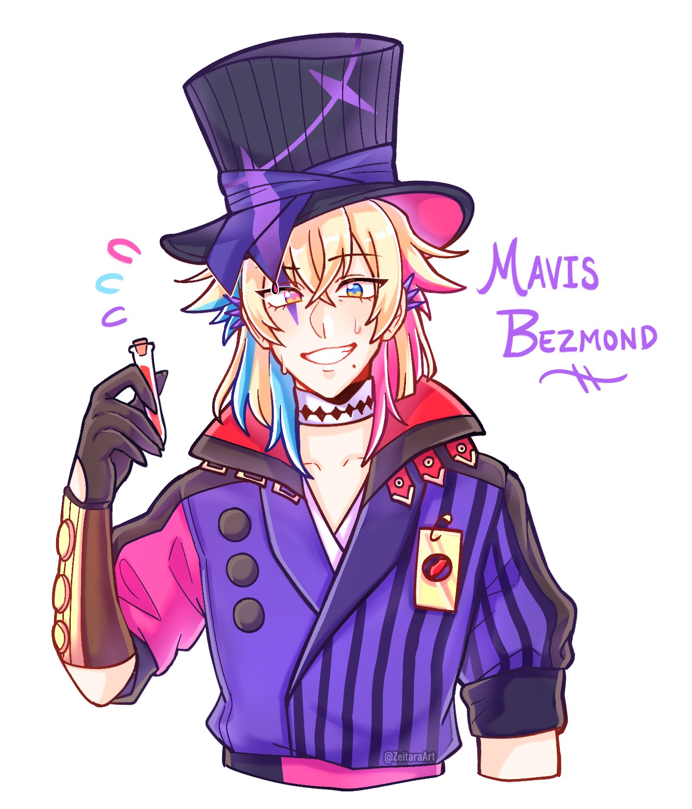 aqua_hair blonde_hair blue_eyes blue_hair ear_piercing gavis_bettel gloves gradient_hair hair_between_eyes hat heterochromia highres holding holostars holostars_english looking_at_viewer magni_dezmond male_focus medium_hair multicolored_clothes multicolored_hair piercing pink_eyes pink_hair patterned_hair purple_hair shirt simple_background smile streaked_hair striped sweat test_tube top_hat virtual_youtuber white_background yellow_eyes zeitaraart