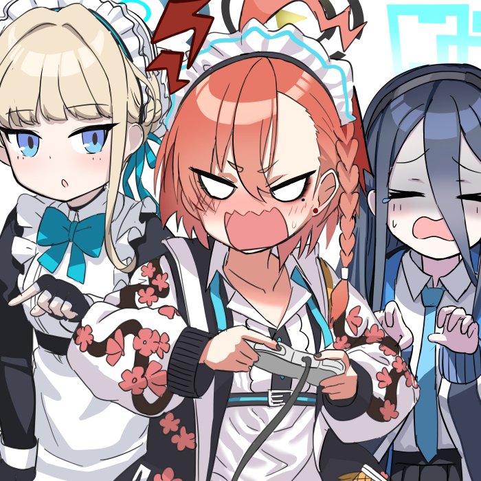 3girls absurdly_long_hair ahoge apron aris_(blue_archive) black_hair blue_archive blue_eyes braid bun_cover collared_shirt commentary_request controller earrings game_controller hair_between_eyes hairband halo holding holding_controller holding_game_controller jacket jewelry light_brown_hair long_hair long_sleeves looking_at_viewer maid maid_apron maid_headdress multiple_girls necktie neru_(blue_archive) open_clothes open_jacket parted_bangs playing_games playing_video_games red_hair school_uniform shirt shooka sidelocks simple_background single_braid sukajan sweatdrop toki_(blue_archive) very_long_hair white_background