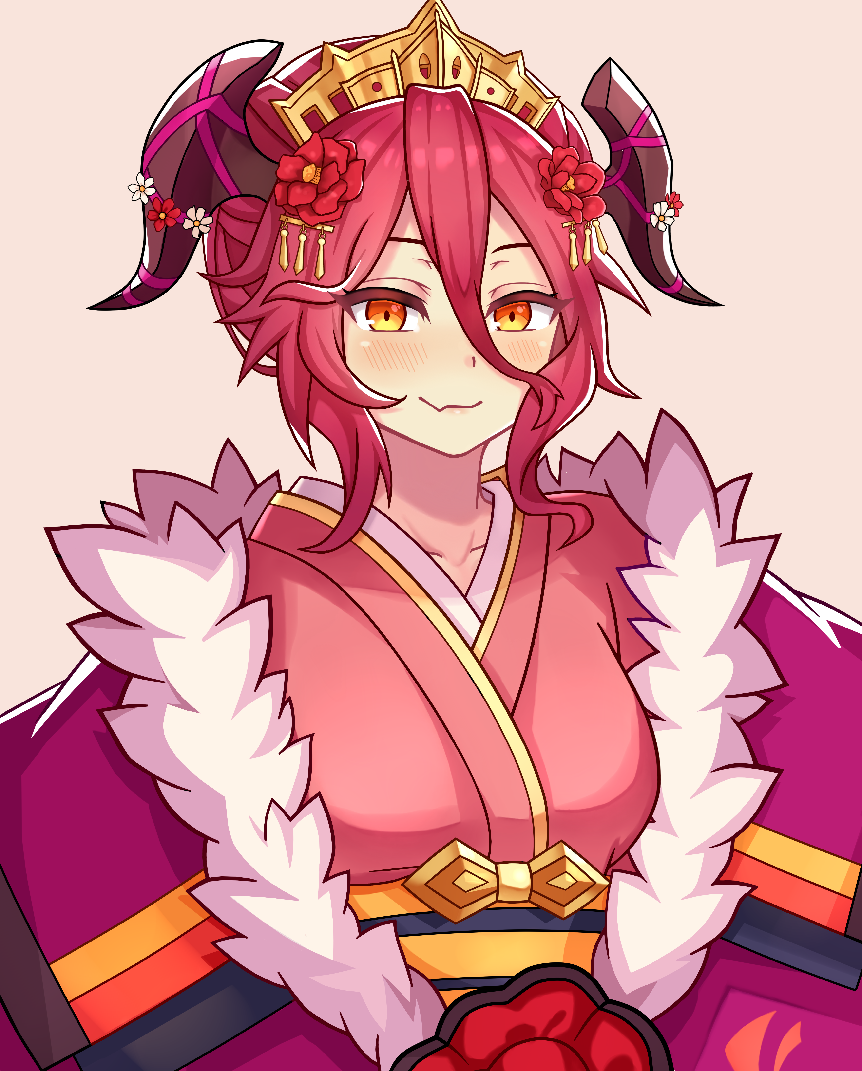 1girl absurdres blush dragalia_lost fang flower fur_trim hair_between_eyes hair_flower hair_ornament highres japanese_clothes kimono long_bangs looking_at_viewer mym_(dragalia_lost) nurufufufu official_alternate_costume red_flower red_hair skin_fang smile solo upper_body yellow_eyes