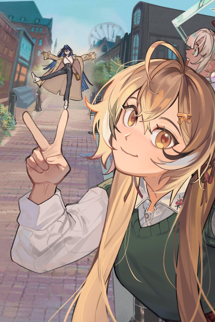 3girls ahoge alternate_costume alternate_hairstyle berry blonde_hair blue_hair blunt_bangs bow bow_earrings brick_road brown_coat brown_eyes brown_hair bush coat dark-skinned_female dark_skin denim dress_shirt earrings eus_ing ferris_wheel fingernails green_sweater_vest hair_intakes hair_ornament hair_ribbon high-waist_pants high_heels hime_cut hololive hololive_english jeans jewelry light_brown_hair limiter_(tsukumo_sana) long_hair looking_at_viewer multicolored_hair multiple_girls nanashi_mumei official_alternate_costume ouro_kronii ouro_kronii_(casual) pants path planet_hair_ornament ribbon road selfie shirt sidelocks smile streaked_hair sweater_vest town tree tsukumo_sana twintails v very_long_hair virtual_youtuber white_shirt