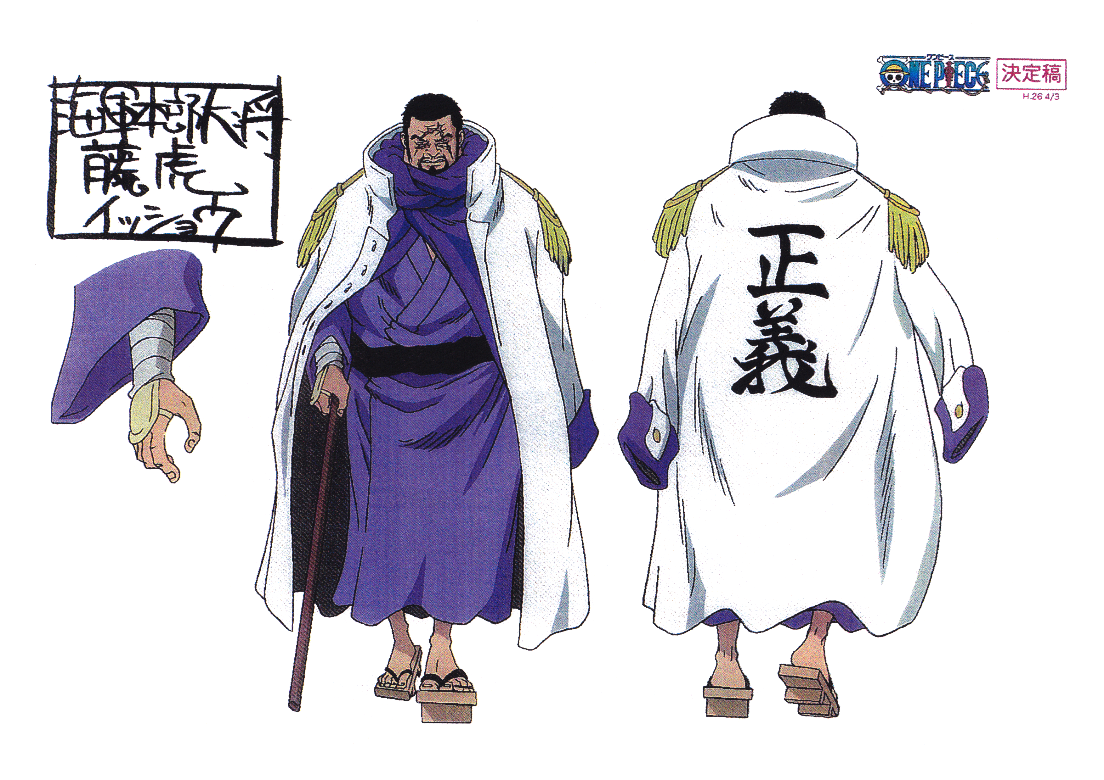 1boy absurdres black_hair blind coat facial_hair fujitora_(one_piece) full_body highres holding holding_sword holding_weapon japanese_clothes logo manly military military_uniform monochrome multiple_views official_art one_piece reference_sheet scan scar scar_on_face short_hair sword translation_request walking weapon