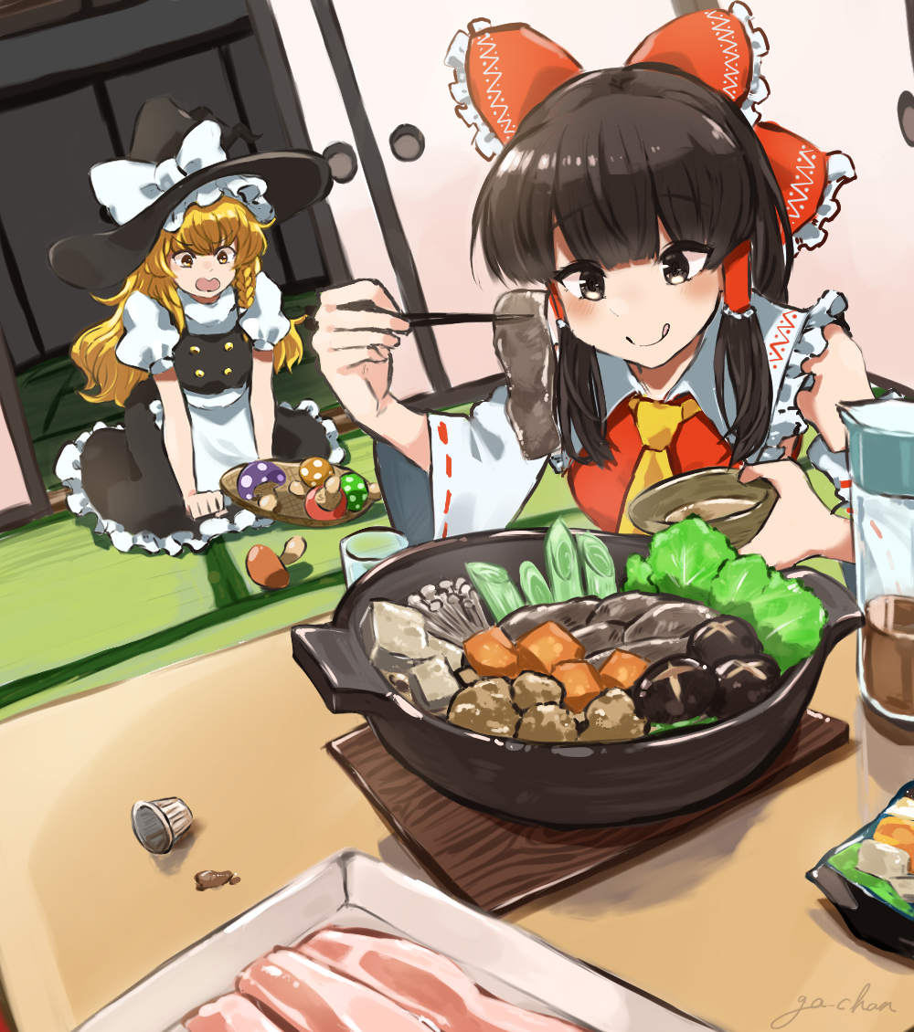 2girls :q ascot blonde_hair blunt_bangs bow bowl braid brown_eyes brown_hair chopsticks detached_sleeves food frilled_bow frills ga-chan_(kokonattusoul) hair_bow hair_tubes hakurei_reimu hat holding holding_bowl holding_chopsticks hotpot indoors kirisame_marisa multiple_girls mushroom nabe perspective ribbon-trimmed_sleeves ribbon_trim seiza shiitake sitting smile table tatami tongue tongue_out touhou witch_hat yellow_eyes