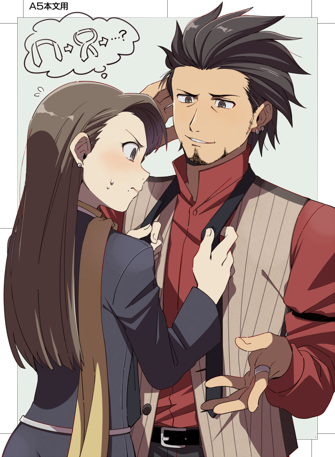 1boy 1girl ace_attorney adjusting_another's_clothes beard belt black_belt black_hair black_jacket blush brown_eyes brown_hair closed_mouth diego_armando earrings facial_hair holding jacket jewelry long_hair long_sleeves looking_at_another mia_fey mole mole_under_mouth phoenix_wright:_ace_attorney_-_trials_and_tribulations pinstripe_pattern pinstripe_vest red_shirt ring scarf shirt short_hair smile speech_bubble standing striped sweatdrop thought_bubble vest wahootarou yellow_scarf