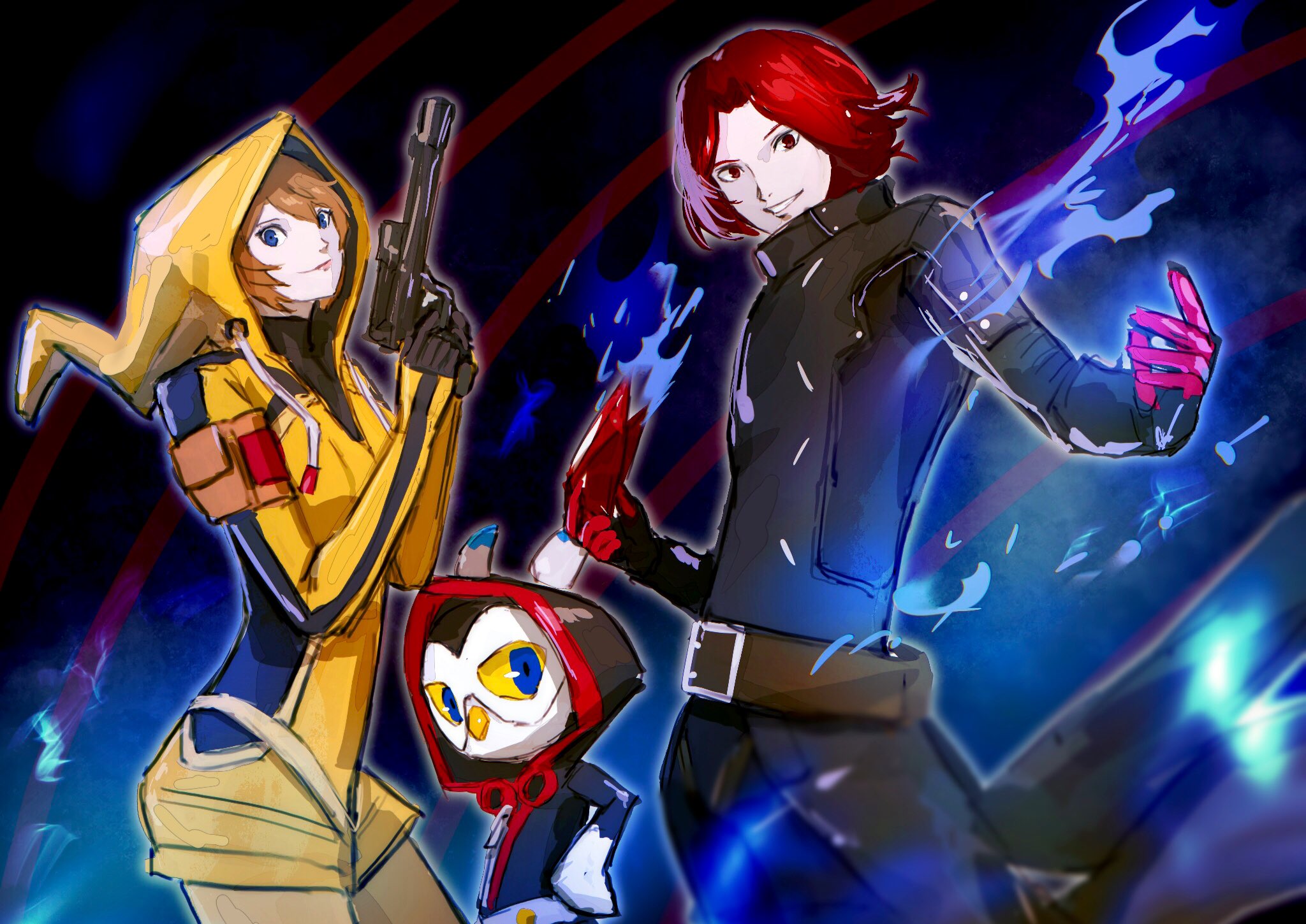 1boy 1girl arai_motoha belt blue_eyes blue_fire brown_hair closer_(p5x) fire gun handgun highres hood hoodie jacket kamishiro_nagisa mask persona persona_5 persona_5:_the_phantom_x rae_ariadne red_eyes red_hair ruferu smile tagme weapon wonder_(p5x)