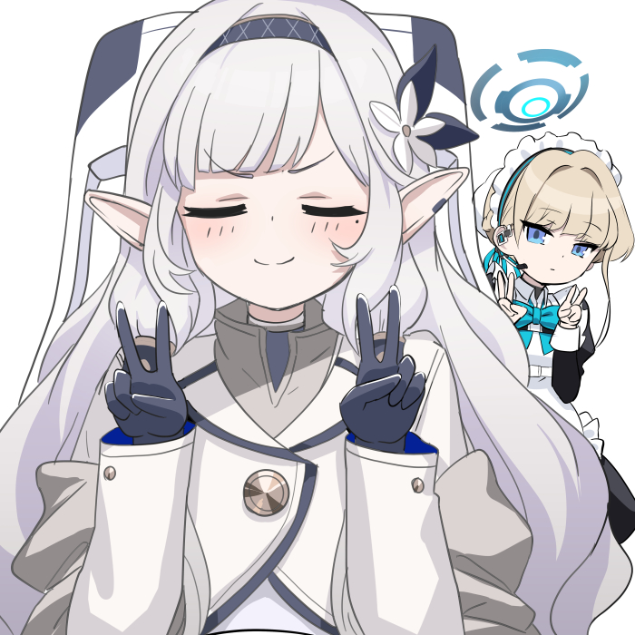 2girls apron black_gloves blue_archive blue_eyes blunt_bangs bow bowtie braid bun_cover collared_shirt commentary_request double_v flower gloves hair_bun hair_flower hair_ornament hairband halo headset himari_(blue_archive) light_brown_hair long_hair long_sleeves looking_at_viewer maid maid_apron maid_headdress mole mole_under_eye multiple_girls parted_bangs pointy_ears shirt shooka sidelocks simple_background single_braid single_hair_bun smile smug solo_focus toki_(blue_archive) v wheelchair white_background white_hair